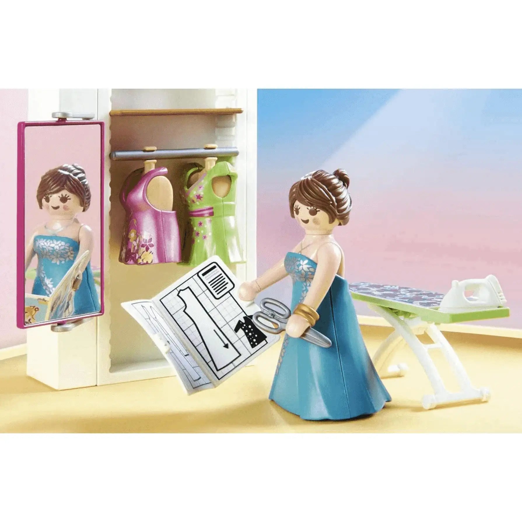 Casa de muñecas con rincón de costura, espejo giratorio, lámparas de cabecera luminosas, figura y muchos accesorios.