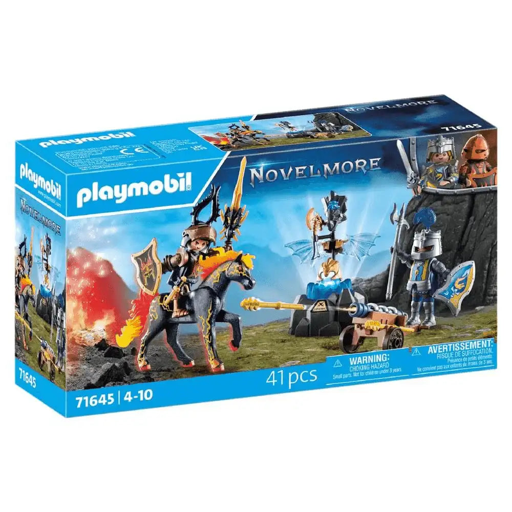 ¿Qué incluye? Los caballeros de Novelmore y de Burnham se enfrentan en un acalorado duelo por la poderosa Armadura del Dragón, ¡la que permite a su portador surcar los cielos como un dragón! ¿Quién saldrá victorioso del duelo? ¿El caballero de Novelmore con el cañón o el caballero negro a caballo? Con armas, ingeniosos sistemas de defensa y personajes originales, el mundo de los caballeros de PLAYMOBIL invitan a un sinfín de aventuras de rol. Un fantástico regalo o recuerdo para los entusiastas de los caballeros a partir de 4 años.