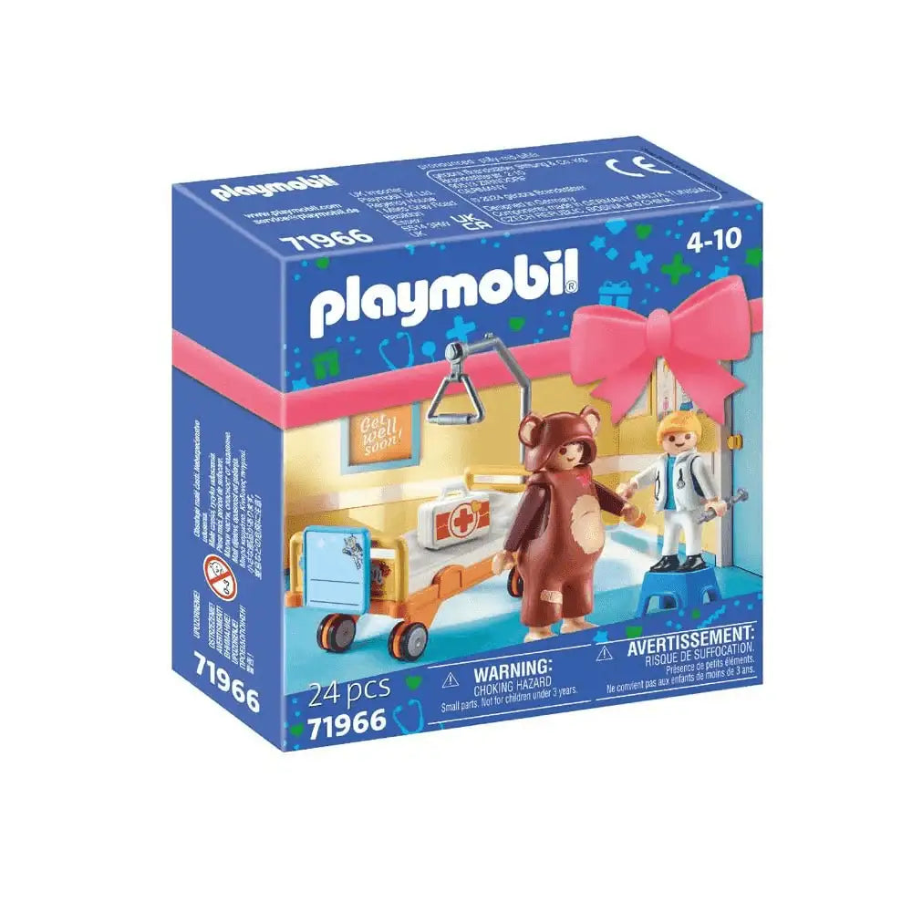 ¿Qué incluye? El pequeño paciente no se encuentra bien, ¡pero el médico está aquí para ayudarle! Con un botiquín muy equipado, el doctor revisa al paciente, asegurándose de que todo está bien. La cama del hospital tiene incluso una pizarra especial para personalizar con dibujos o notas. Con la hoja de pegatinas, el doctor aplica tiritas y vendas para hacer sonreír al paciente. Este producto PLAYMOBIL incluye un disfraz de oso, un detallado kit de médico y divertidos accesorios para crear historias de cuidados y recuperación. ¡PLAYMOBIL convierte cada momento en una aventura!