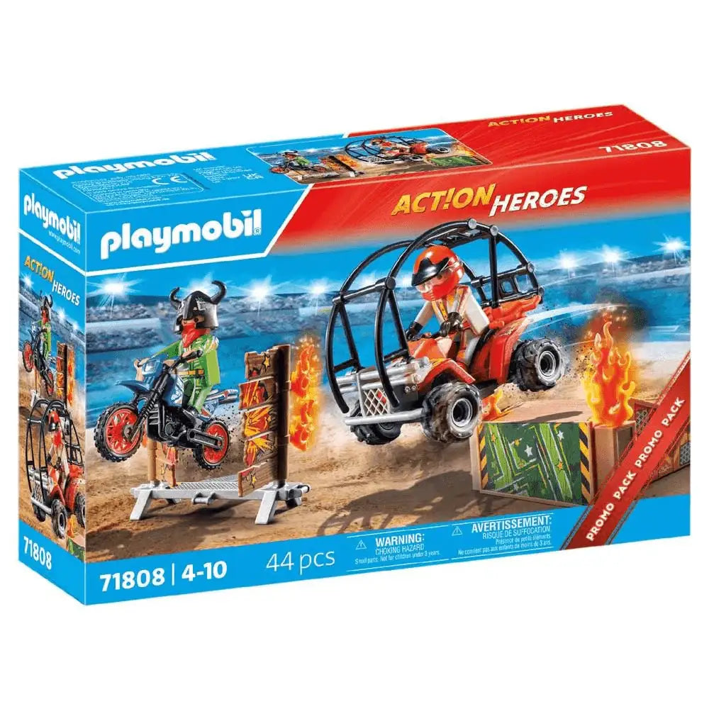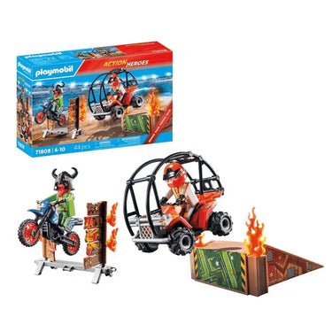 ¿Qué incluye? Emociones fuertes en el espectáculo de acrobacias de PLAYMOBIL. El motorista se lanza desde la rampa contra el muro de tablones oscilantes o se eleva entre abrasadoras llamas. Mientras tanto, el piloto del quad se prepara para la próxima acrobacia y atraviesa la rampa con estilo. El producto incluye un quad con motor retráctil, una moto acrobática para saltos épicos y un montón de accesorios. La rampa y el muro desmontables facilitan las acrobacias, mientras que el muro de tablones oscilantes añade un toque realista al moverse con el impacto. Perfecto para pequeñas y pequeños buscadores de emociones.