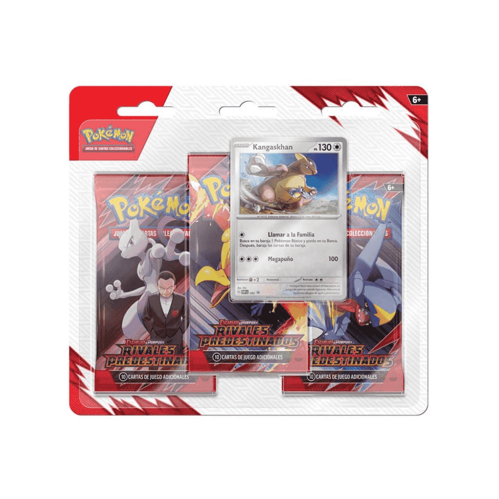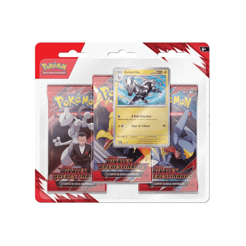 - Contenido del Pack: 3 sobres de refuerzo del set Rivales Predestinados, cada uno con 10 cartas aleatorias.