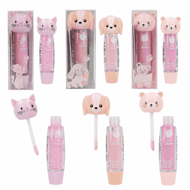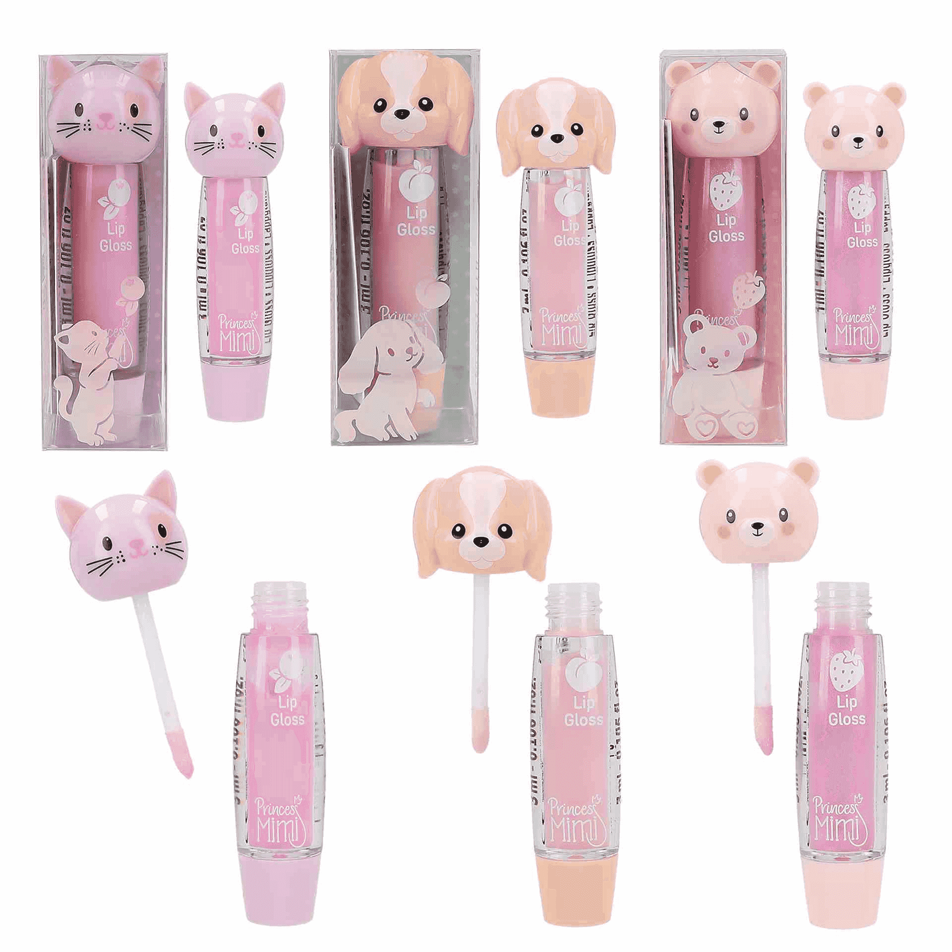 Para los primeros pasos de belleza, ¡brillo labial de Princess Mimi, animaladamente mono! Las capuchas con aplicador tienen forma de perro, oso y gato. Los labiales son de colores suaves brillantes y tienen aromas deliciosos: gato lila con brillo labial fucsia y aroma a arándano; perro marrón claro con brillo labial color melocotón y aroma a melocotón; oso rosa con brillo labial rosa y aroma a fresa. (Contenido de cada labial: 3 ml). transparente con práctico cierre de clip. Instrucciones ilustradas incluidas. por 100. Material: poliéster reciclado 100 por 100. de instrucciones de uso.