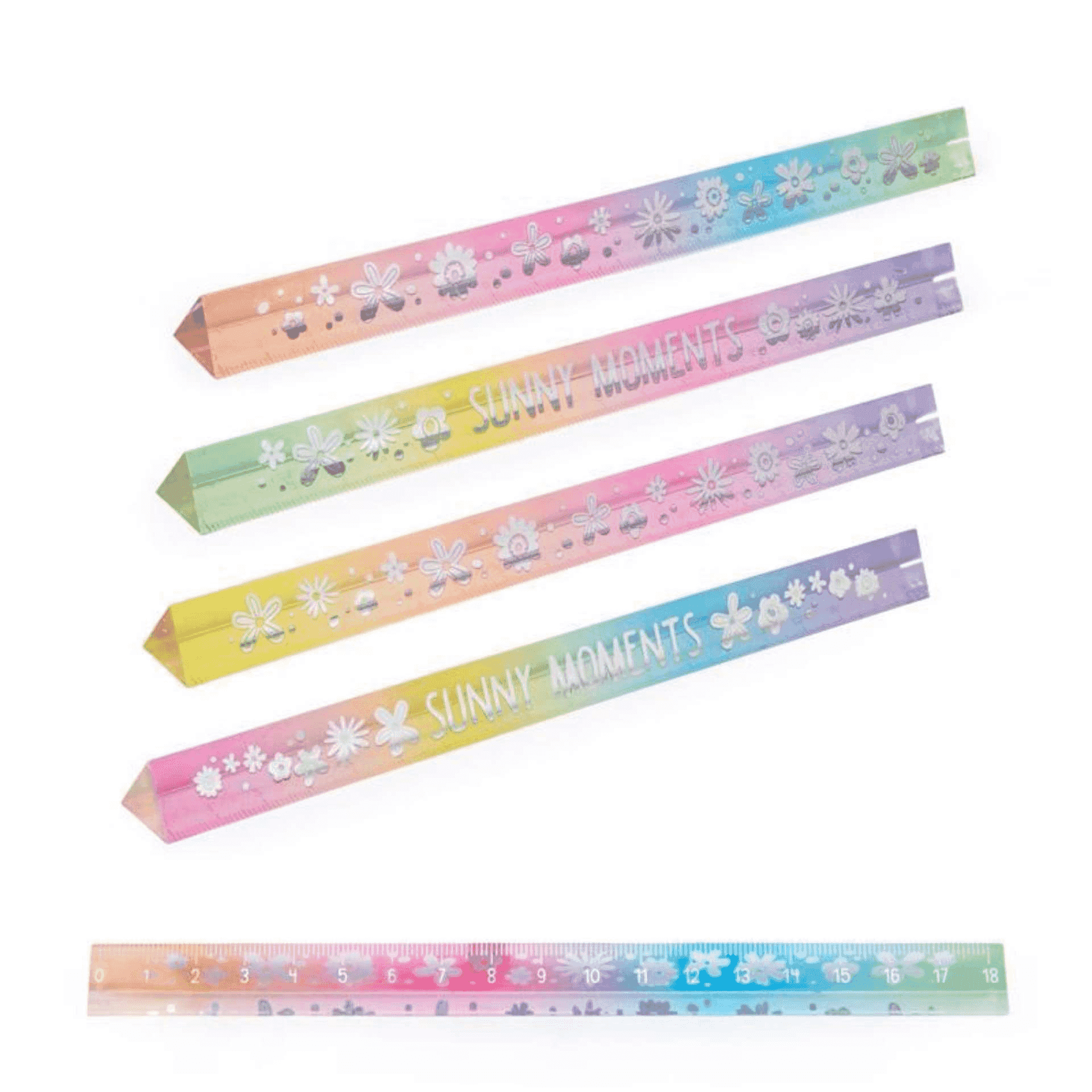 Fabricada en acrílico transparente con degradado de colores arcoíris y un elegante grabado plateado, esta regla de 18 cm es un auténtico imán de miradas. Disponible en 4 modelos surtidos, todos igual de chulos.