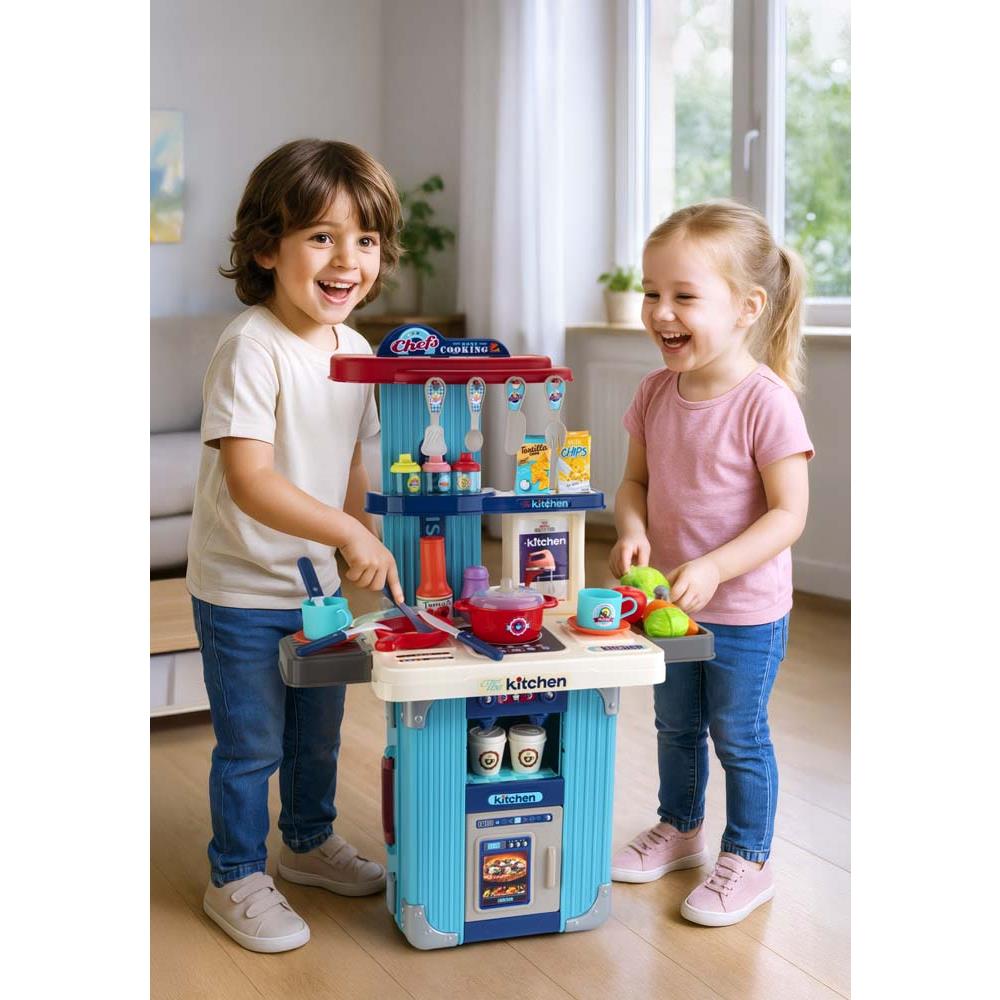 - +20 accesorios: ollas, sartenes, cubiertos, alimentos y envases de juguete.