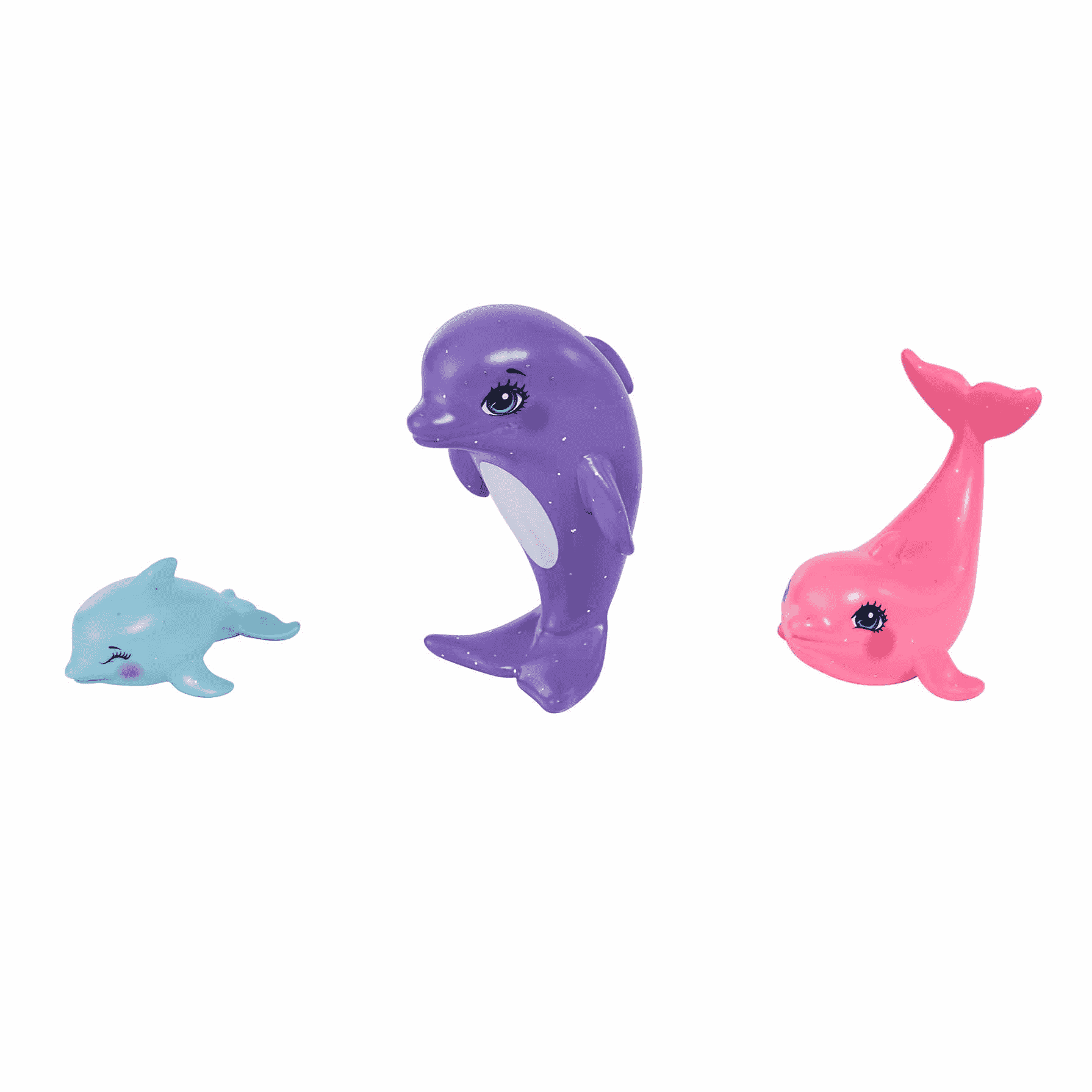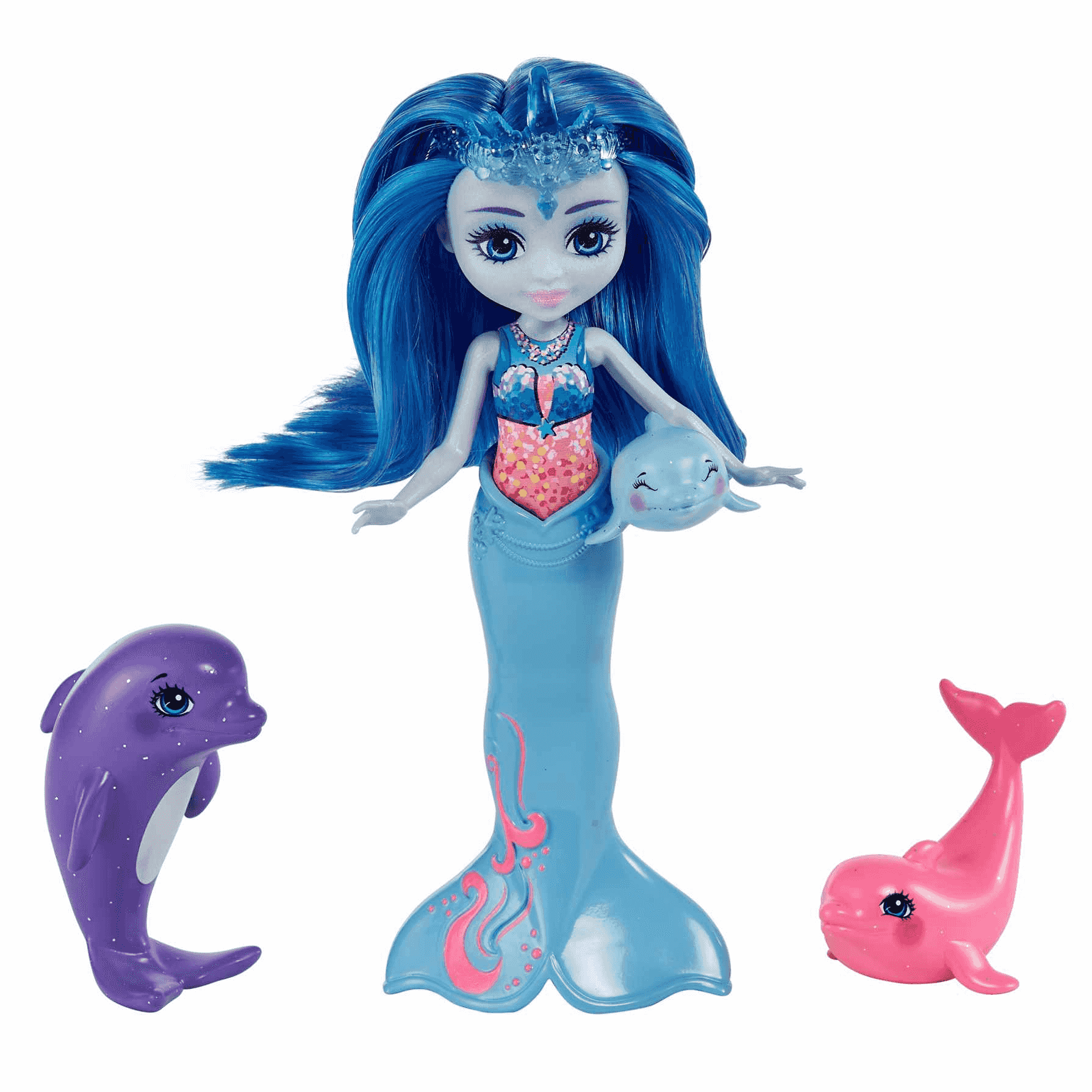 Conjunto de juguetes familiar de Enchantimals, muñeca Dorinda Dolphin (15,24cm), con cola extraíble y 3 figuras de delfines, regalo ideal para niñas de 3 a 8 años