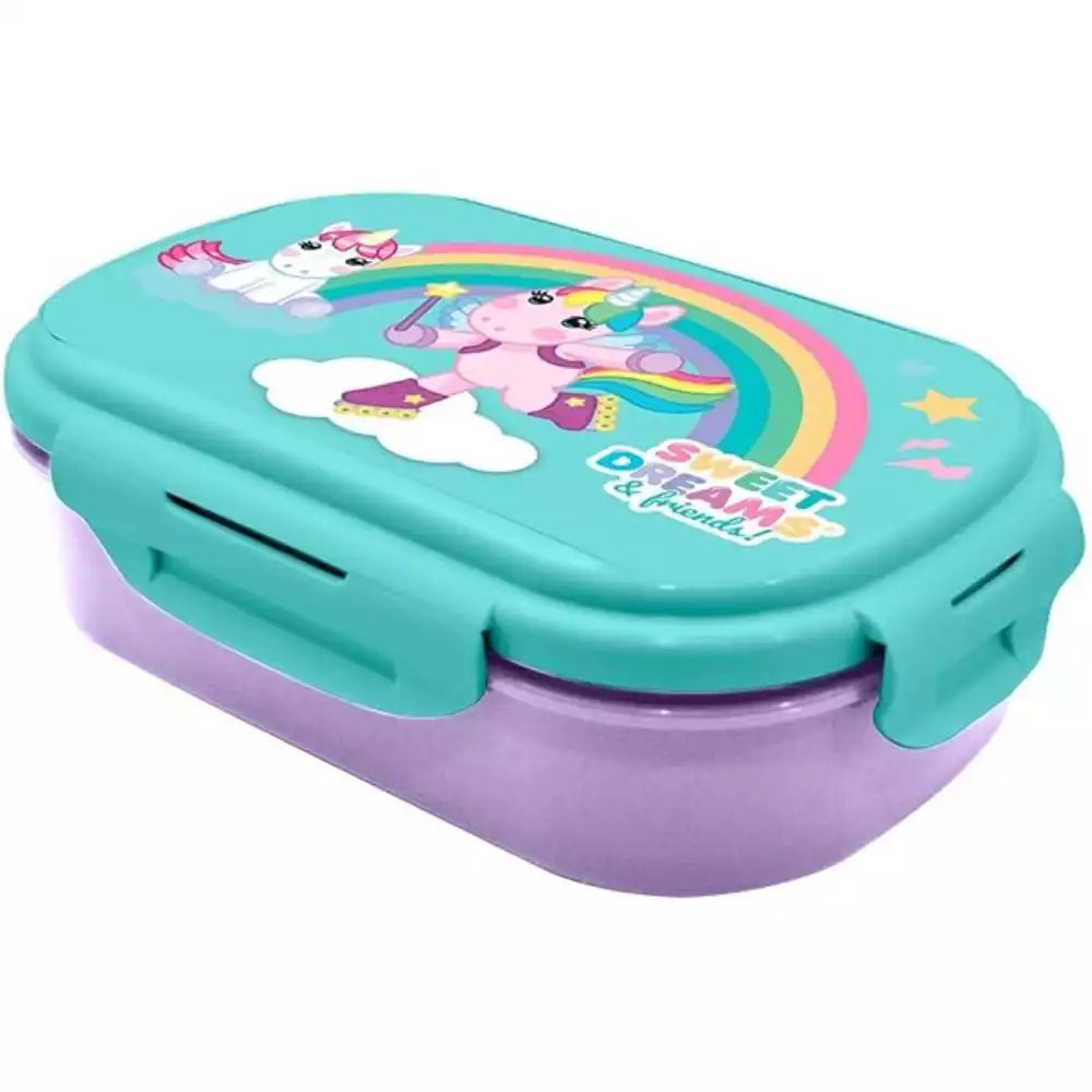 La Sandwichera Sweet Dreams con Cubiertos es perfecta para llevar tus comidas al cole o de excursión. Con un diseño lleno de color, unicornios y arcoíris, convierte cada merienda en un momento divertido.