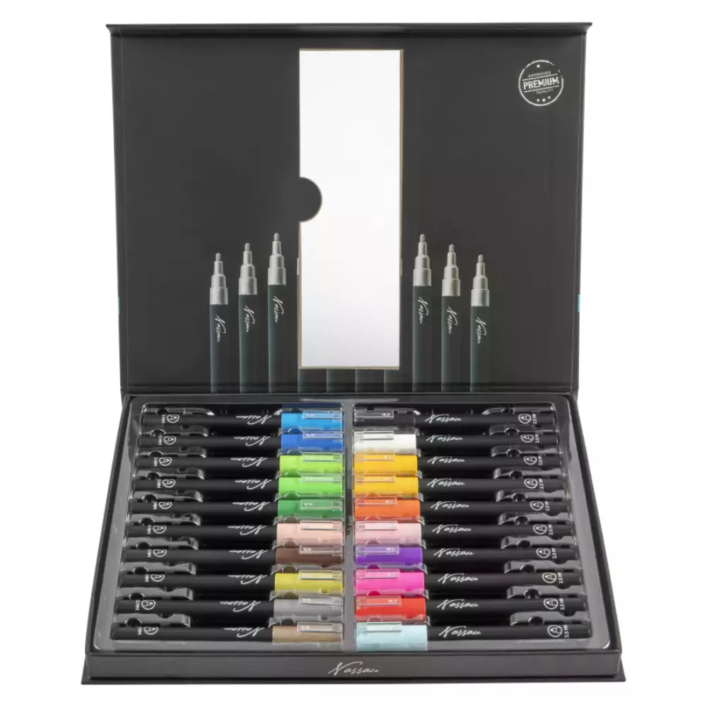 Este conjunto incluye 20 marcadores de acrílico Nassau presentados en un práctico estuche tipo window box. Ideales para crear sobre múltiples superficies como papel, madera, vidrio o cerámica. :contentReference[oaicite:4]{index=4}