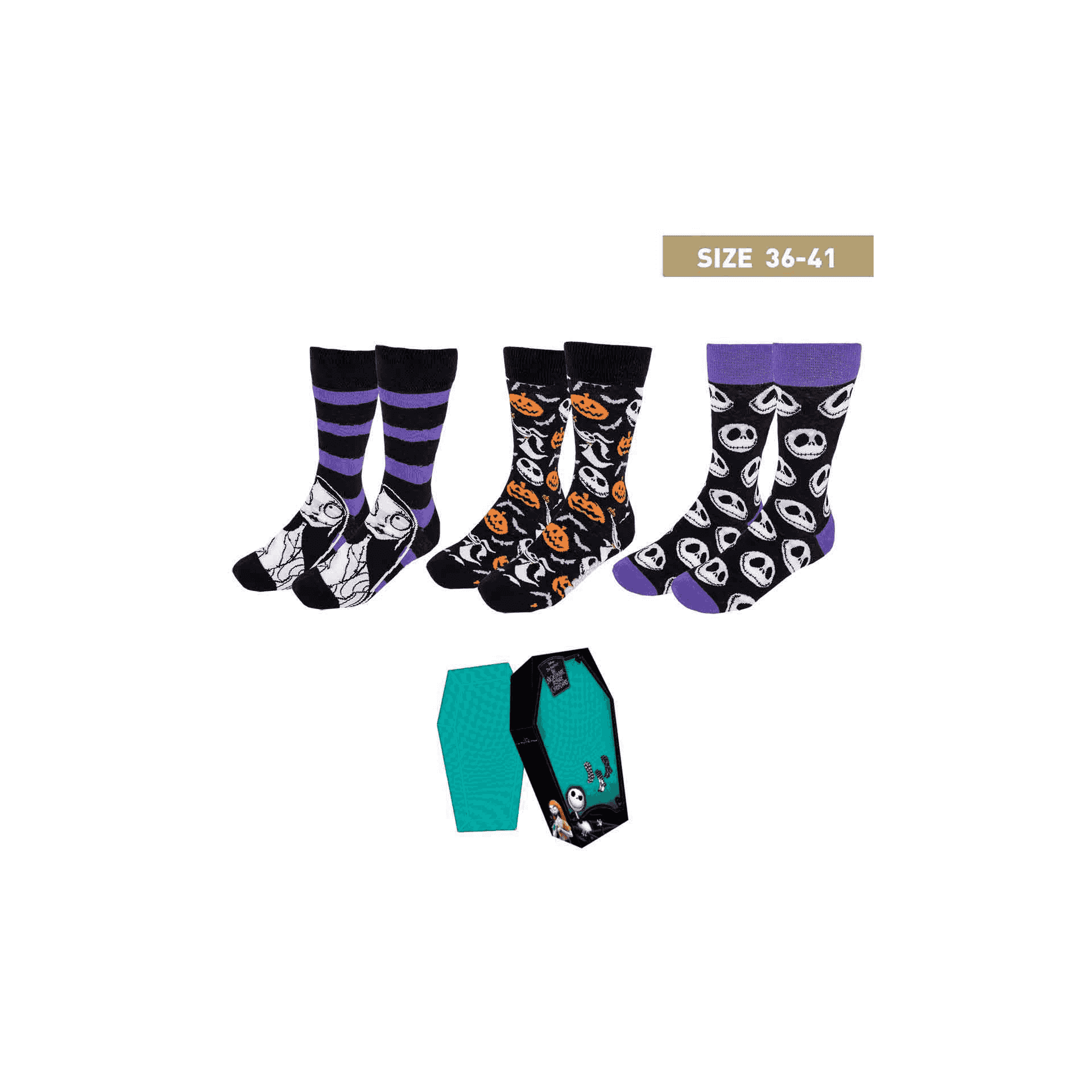 - Set de 3 Calcetines: El set incluye tres calcetines con diferentes diseños, lo que te permite variar tu estilo y lucir a tus personajes favoritos de Pesadilla Antes de Navidad.