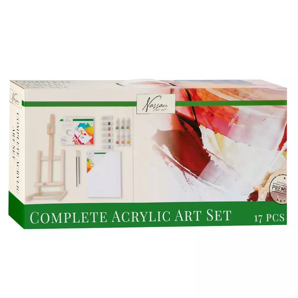 ¡Todo lo que necesitas para empezar a pintar ya está en este set! El Set Nassau Complete Acrylic 17 piezas incluye 12 tonos de pintura acrílica (59 ml cada uno), 2 pinceles, un caballete, un lienzo y un bloc de hojas para usar como paleta de mezcla. Un kit ideal para artistas novatos o experimentados. :contentReference[oaicite:7]{index=7}