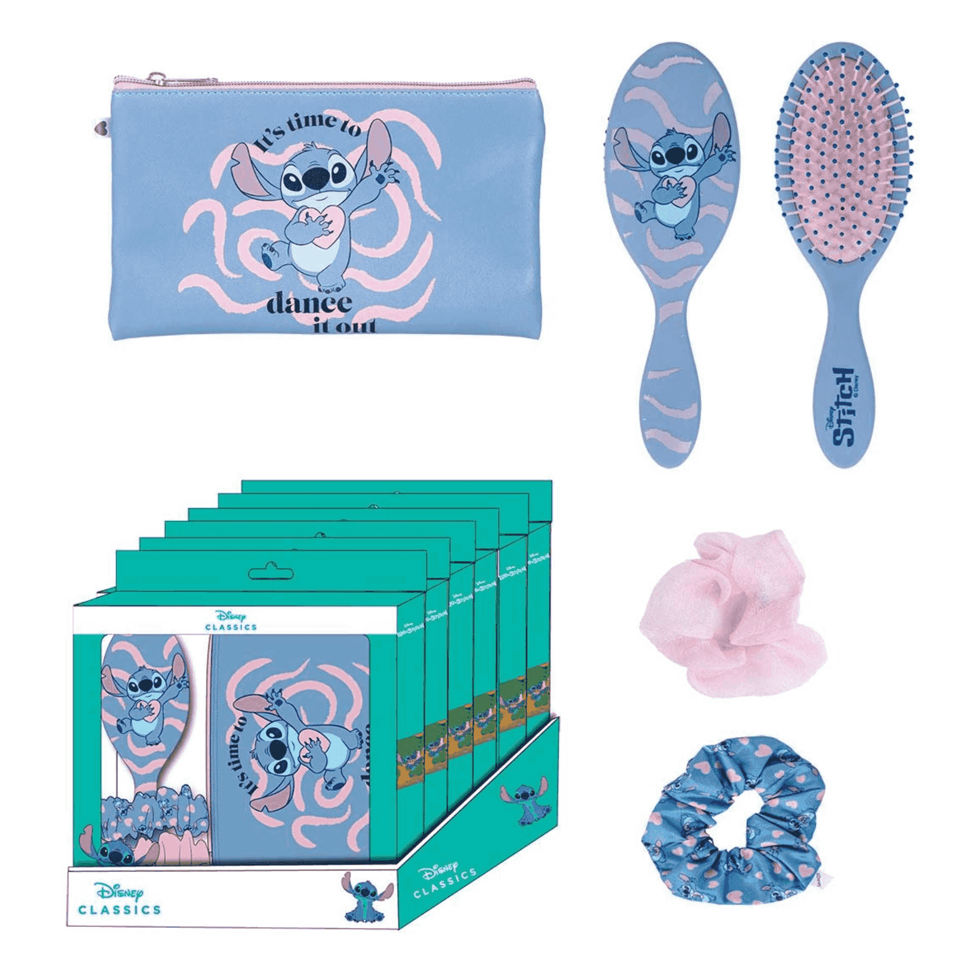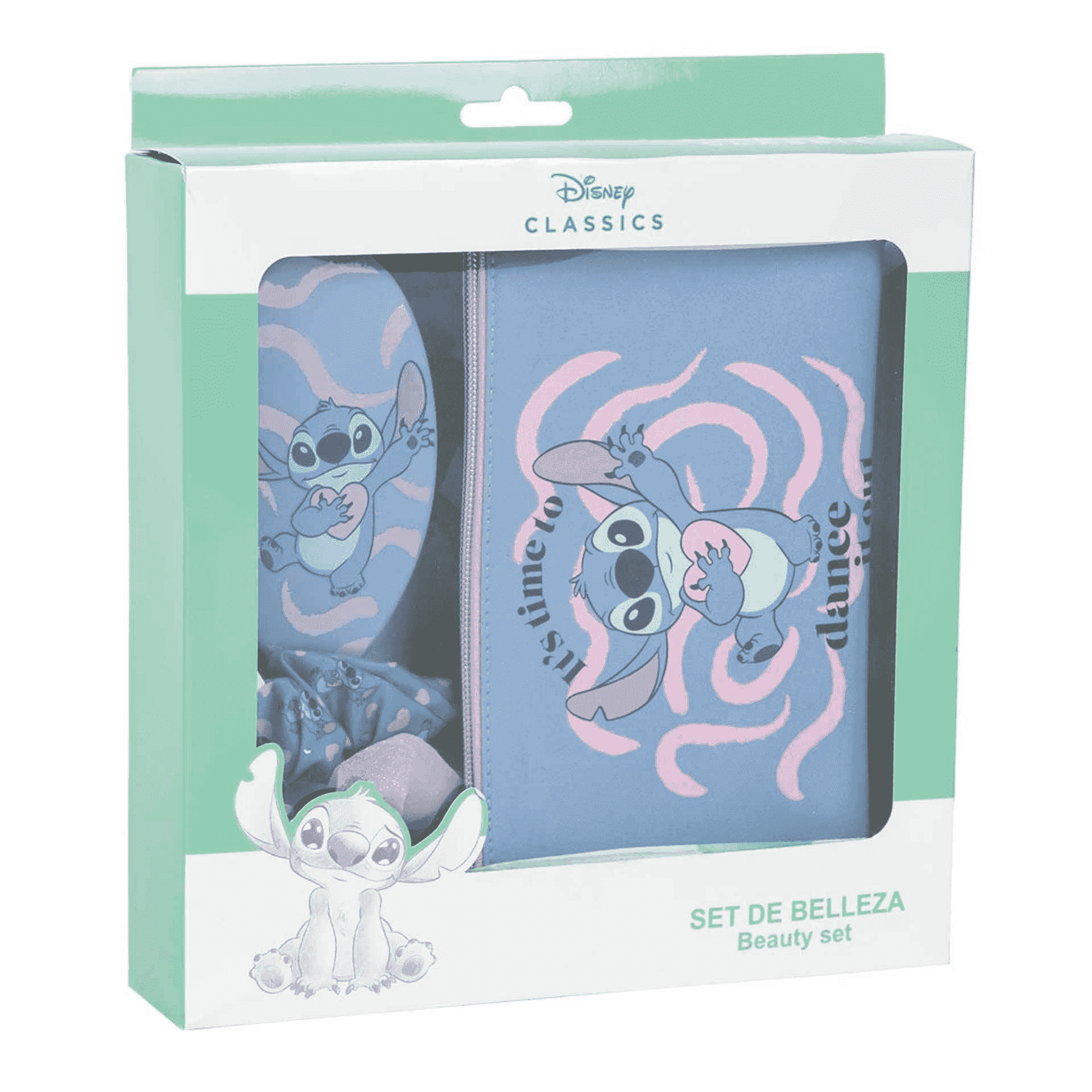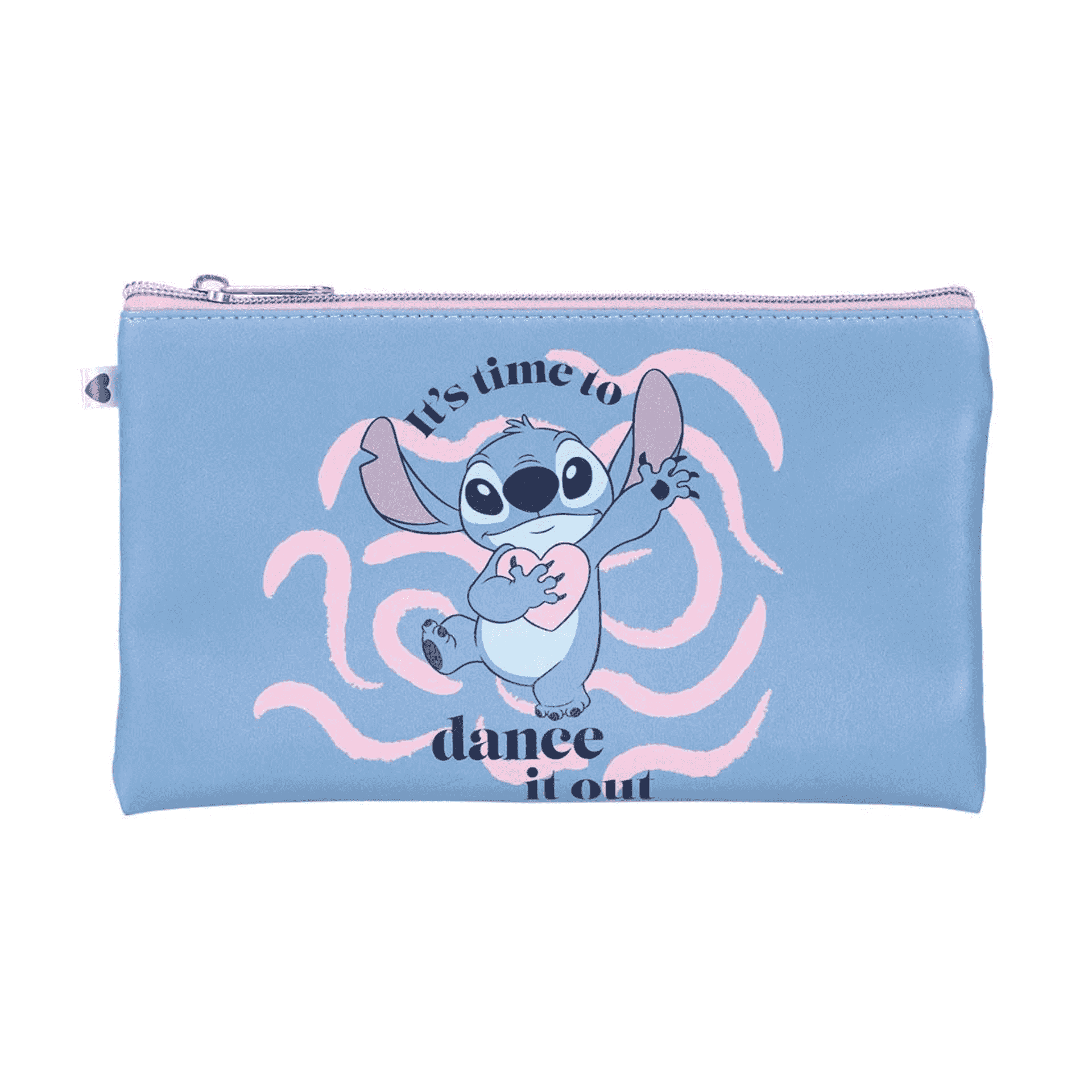 - Neceser adorable: Guarda tus accesorios en un neceser con la imagen de Stitch bailando y la frase 'It´s time to dance it out'.