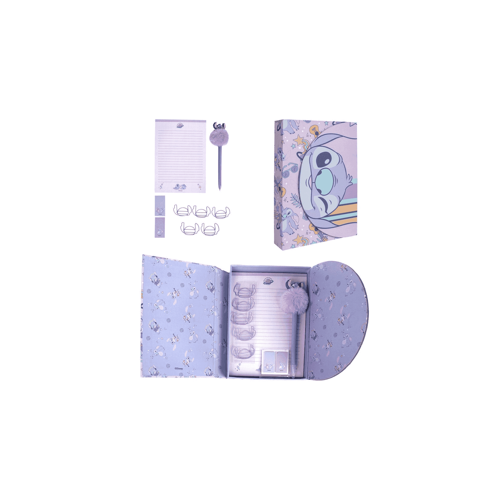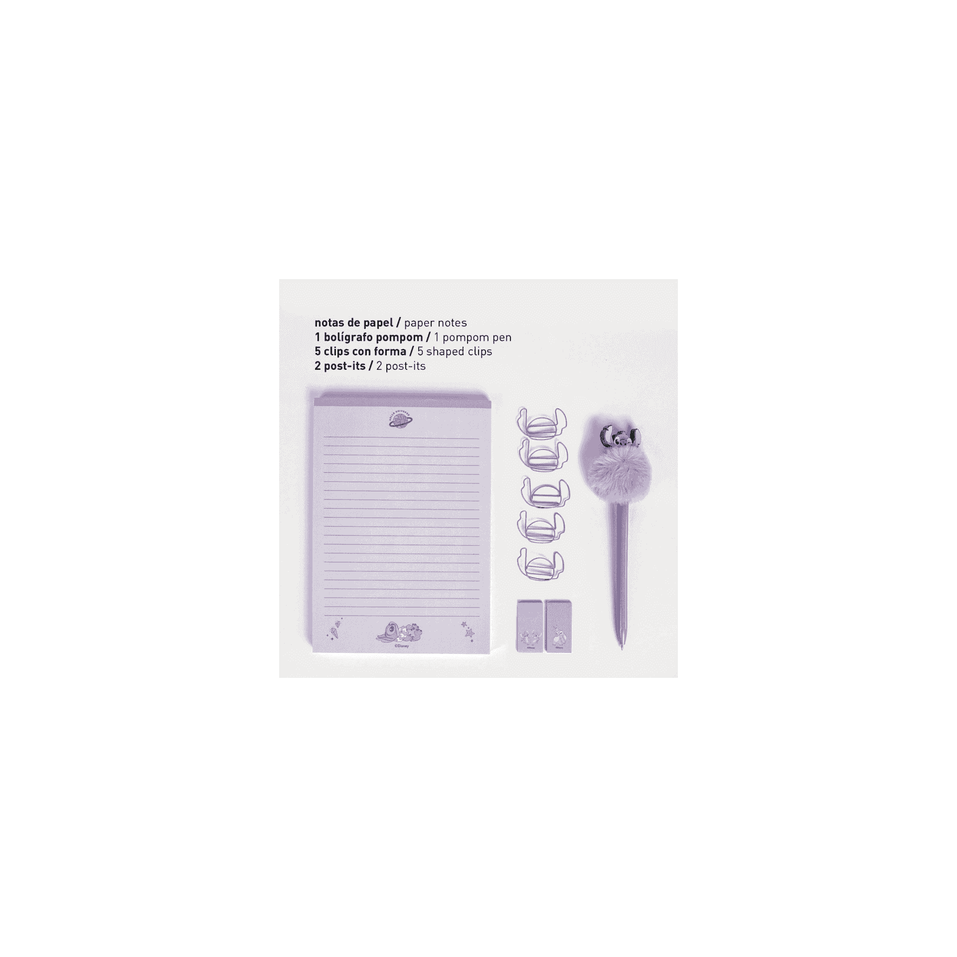 El set incluye una libreta A6, un lápiz de color, un lápiz HB, una goma y clips metálicos, todo decorado con imágenes de Stitch y su amor Angel. Con su diseño colorido y alegre, será un regalo ideal para los seguidores del mundo de Disney.