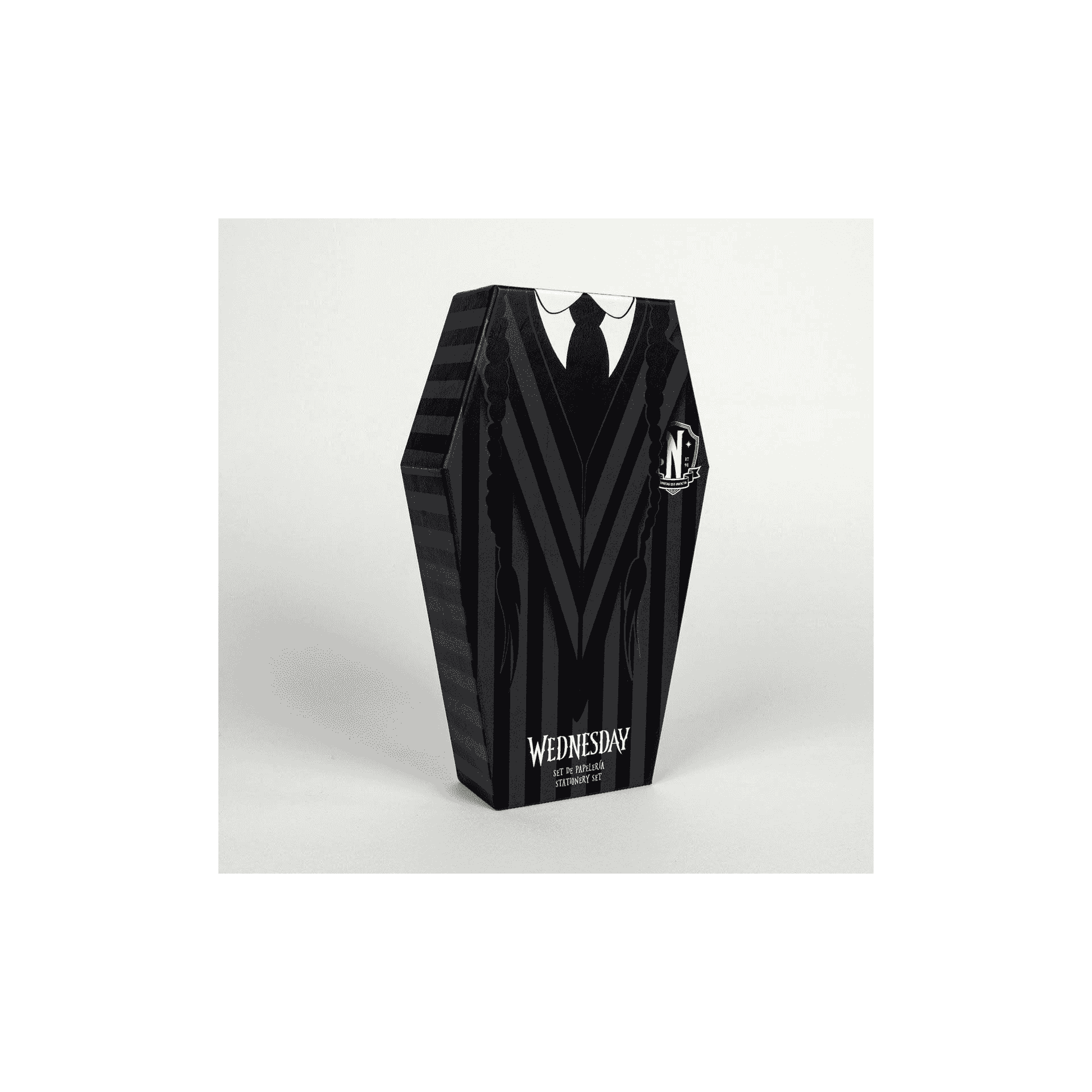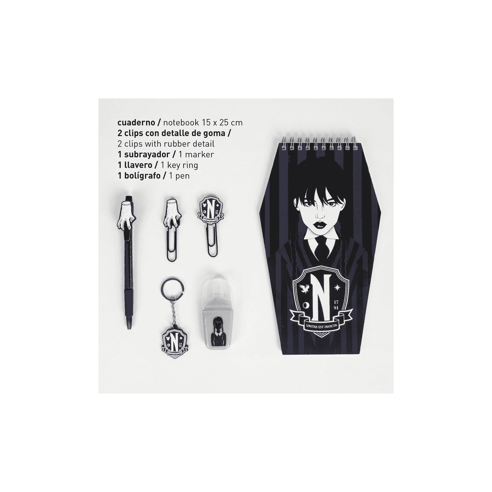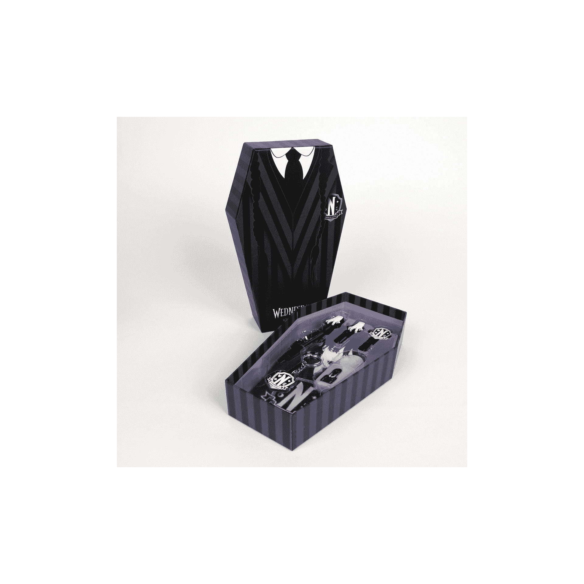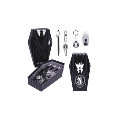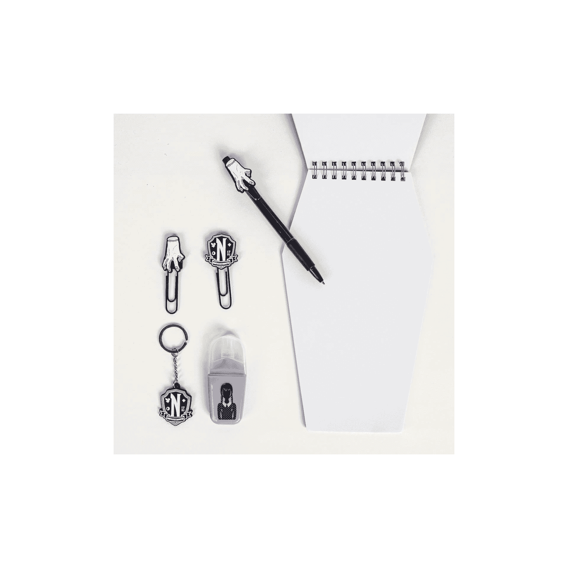 Este elegante set de papelería de ´Wednesday´ trae la esencia gótica del personaje de Miércoles Addams con un diseño oscuro y sofisticado. El set incluye varios artículos temáticos: un bloc de notas en forma de ataúd, un bolígrafo, dos clips decorativos, un llavero, un sacapuntas y una goma de borrar. Todos vienen presentados en una caja con forma de ataúd, ideal para los amantes de la serie de Netflix que quieren llevar el estilo de Miércoles a su día a día.