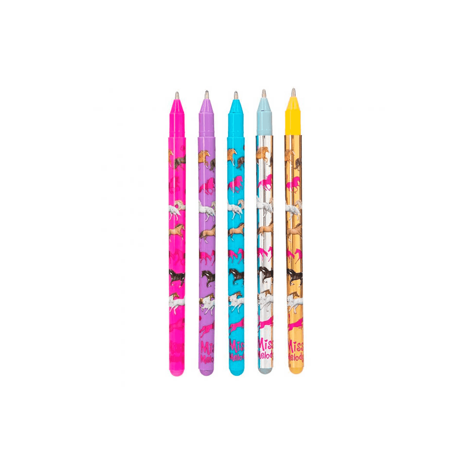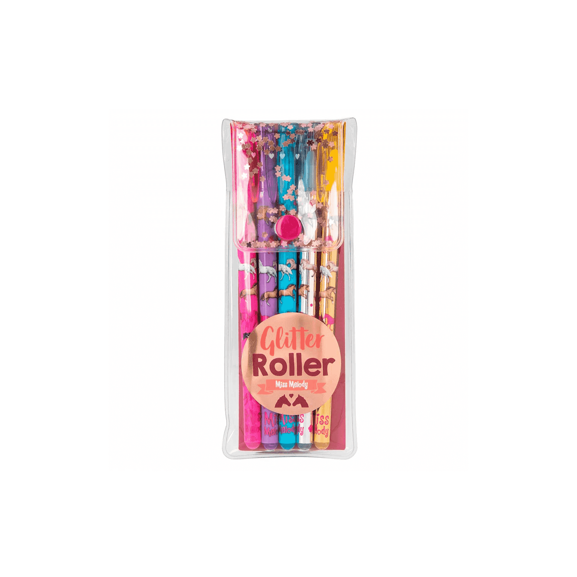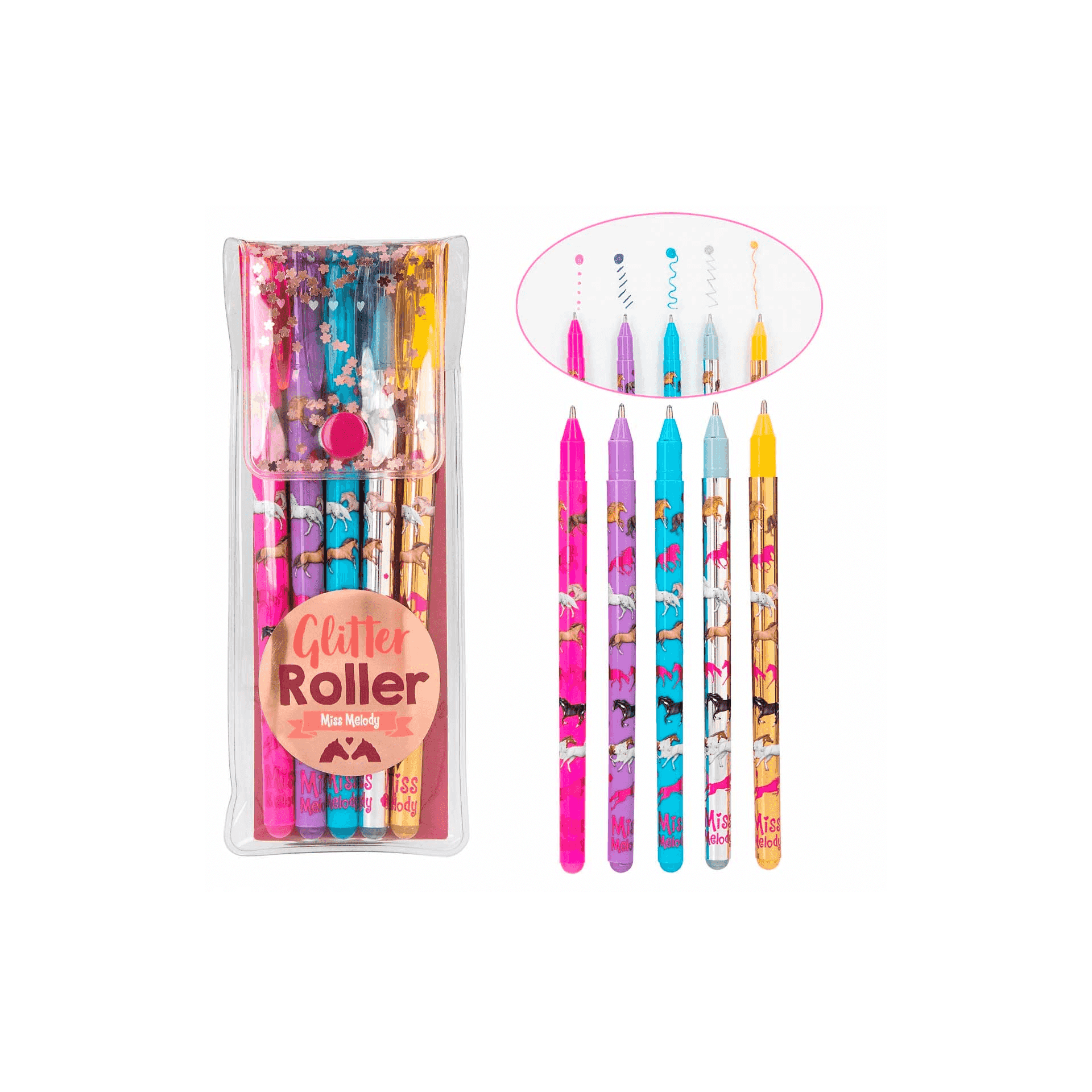 Explora un mundo brillante y lleno de color con los 5 rotuladores de gel de purpurina de Miss Melody. Cada rotulador, disponible en rosa, lila, azul, plata y oro, está decorado con una encantadora estampación allover de caballos que seguramente encantará a cualquier niño creativo. Estos rotuladores no solo son una herramienta artística práctica, sino que también son una verdadera delicia visual.