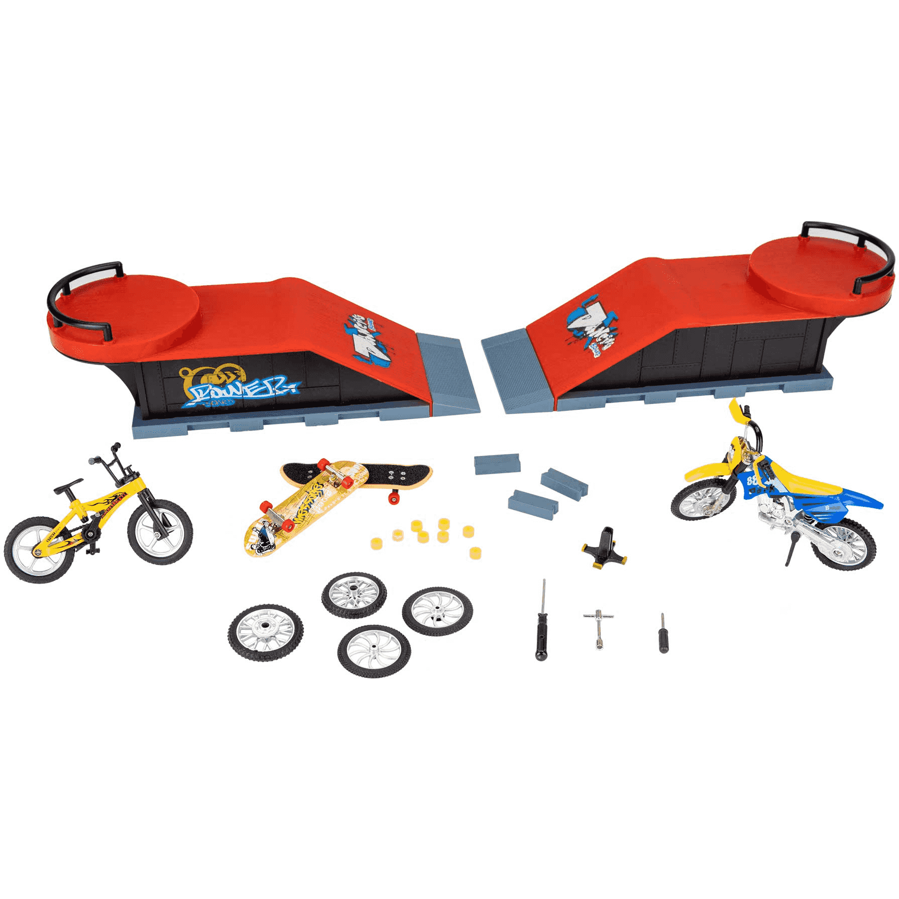 Es un juguete de nuestra marca propia que pertenece a la linea Motor Planet. Este juguete viene con los accesorios necesarios para que los niños puedan hacer multitud de piruetas y saltos. El set incluye plataformas, bicicletas y skates. También incorpora diversas herramientas para poder armar, desarmar y combinar las diferentes piezas.