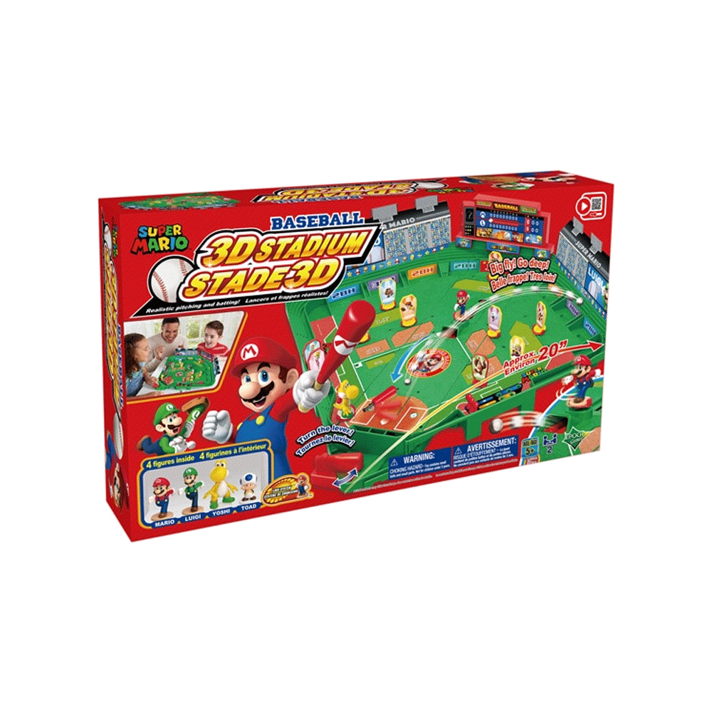 Super Mario Baseball 3D Stadium es un dinámico juego de mesa inspirado en el universo de Super Mario que traslada toda la emoción del béisbol a un formato compacto y lleno de acción. Pensado para niñas y niños a partir de 4 años, combina habilidad, reflejos y diversión en un estadio en miniatura con efecto 3D que recrea la experiencia de un auténtico partido.