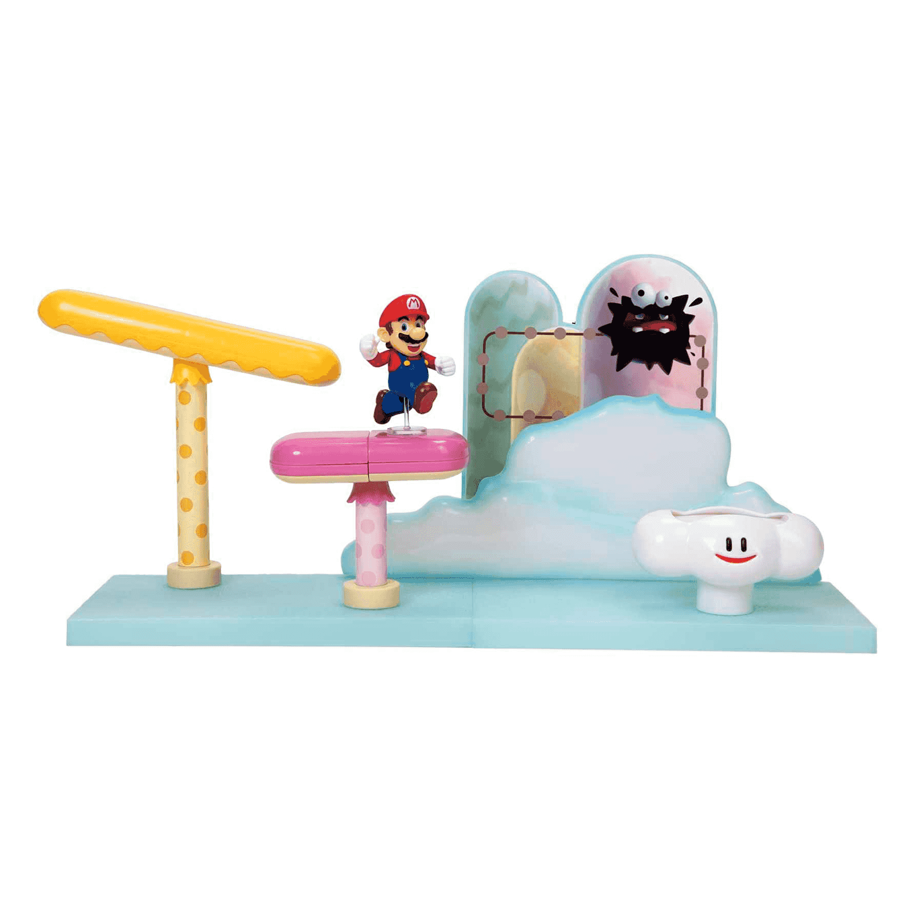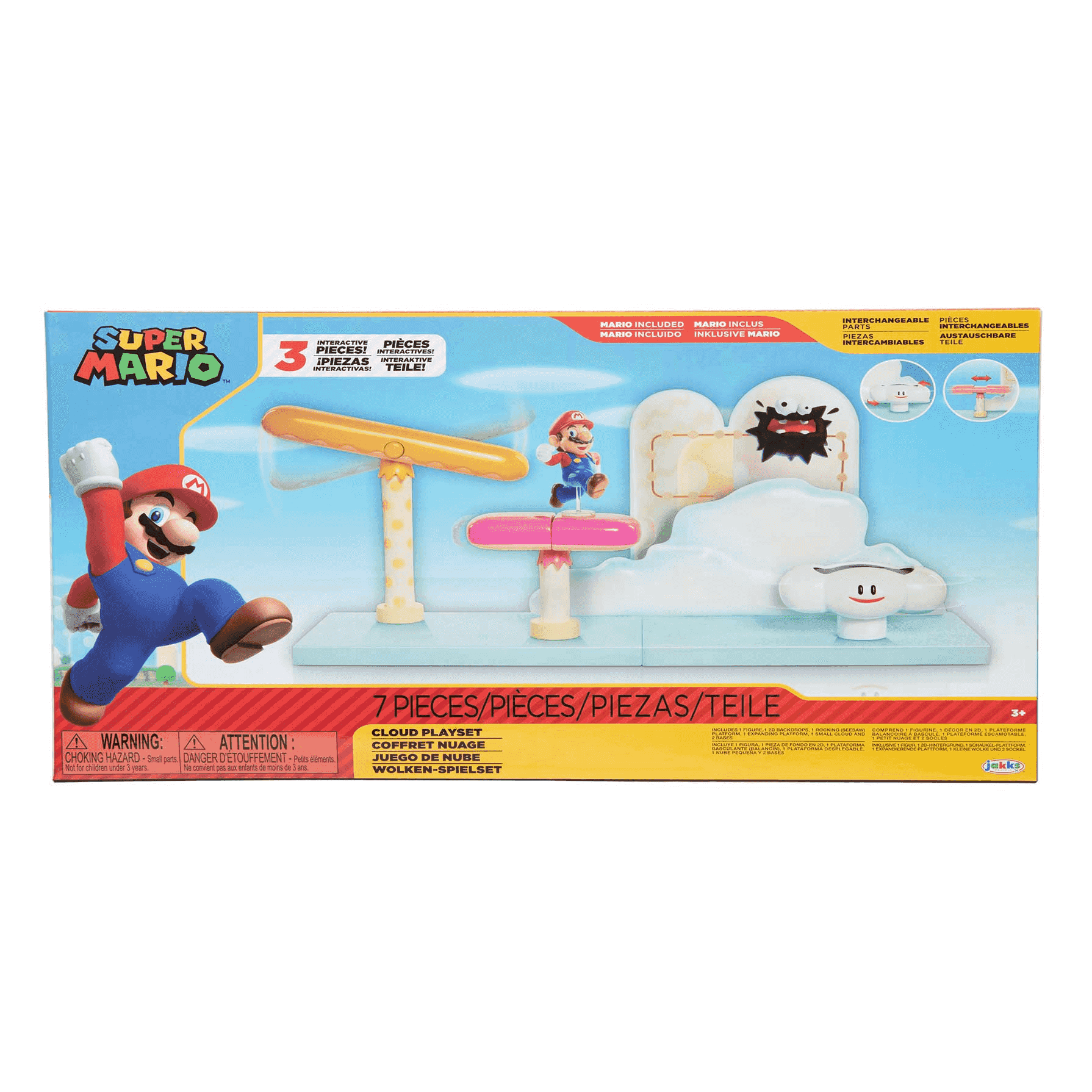 El playset Nube de Super Mario Nintendo es un set con diferentes accesorios y escenarios que incluyen una figura de Mario. Este juguete está basado en el famoso videojuego y representante de la cultura popular Super Mario. La imagen de este curioso fontanero con bigote está relacionada directamente con la infancia de muchos adultos y aún sigue siendo un icono para los niños.