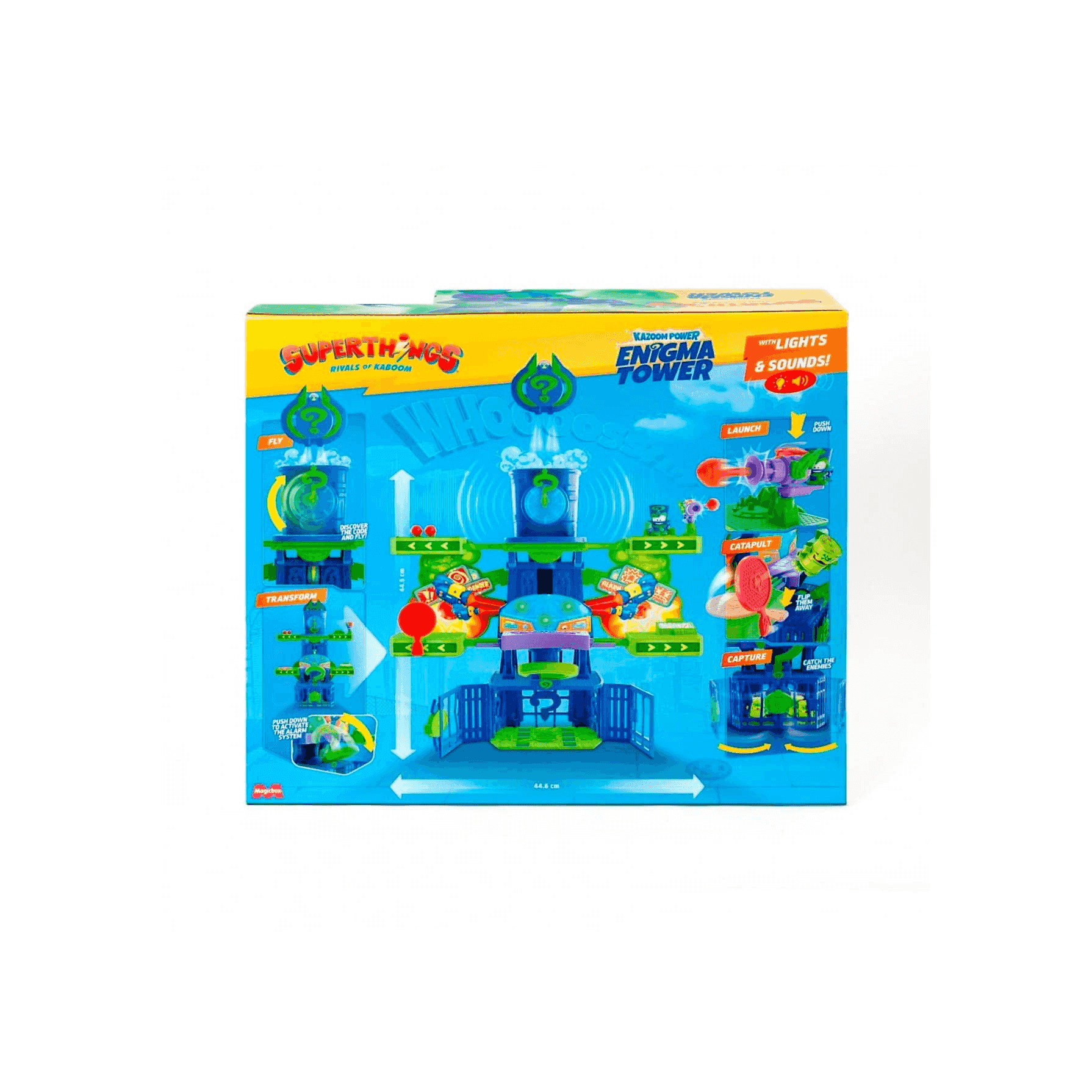 El Superthings Kazoom Power Enigma Tower es un set de juego lleno de acción y aventura diseñado para los pequeños fanáticos del universo SuperThings. Este juguete permite a los niños crear y recrear sus propias historias de batallas épicas en Kaboom City con la misteriosa torre del Enigma.