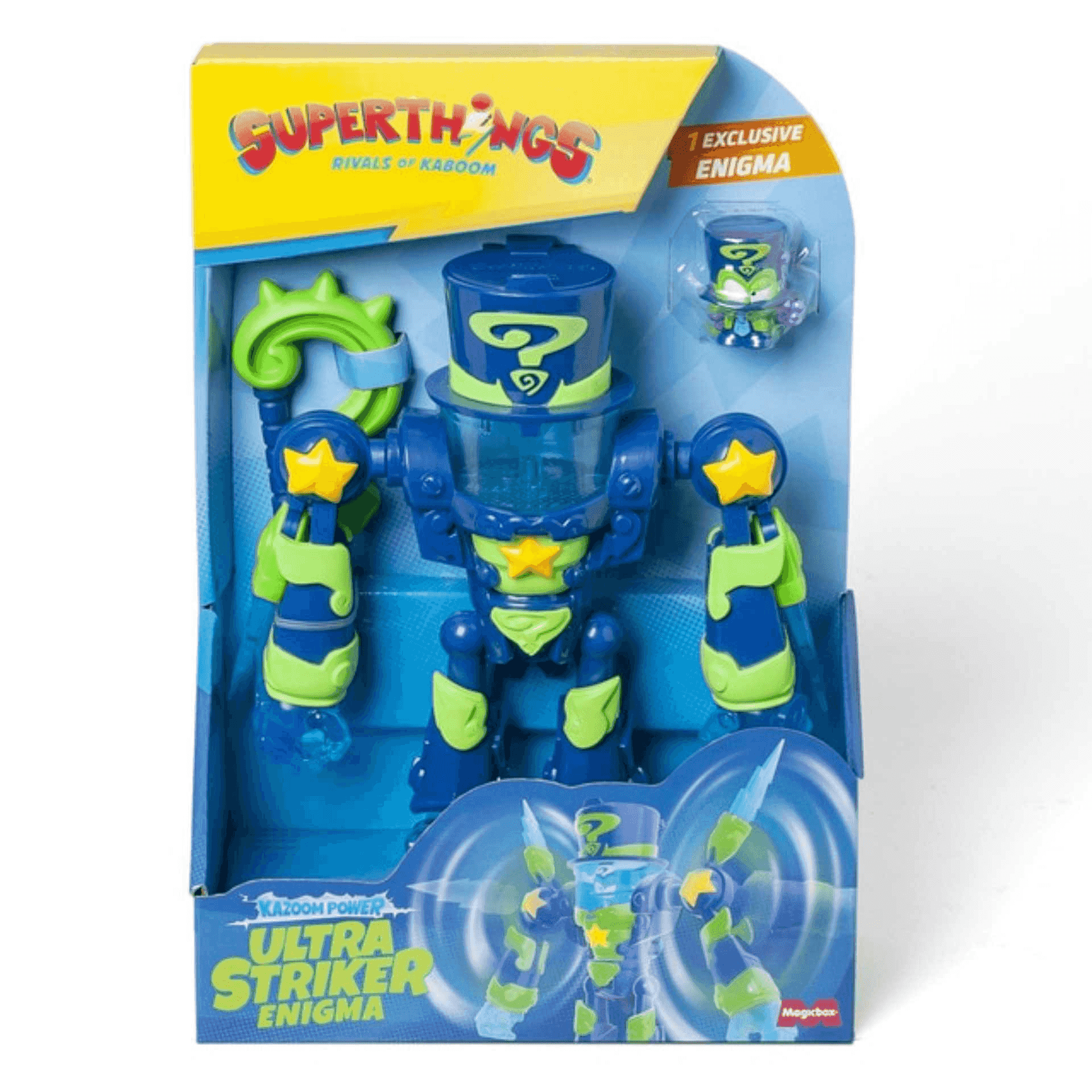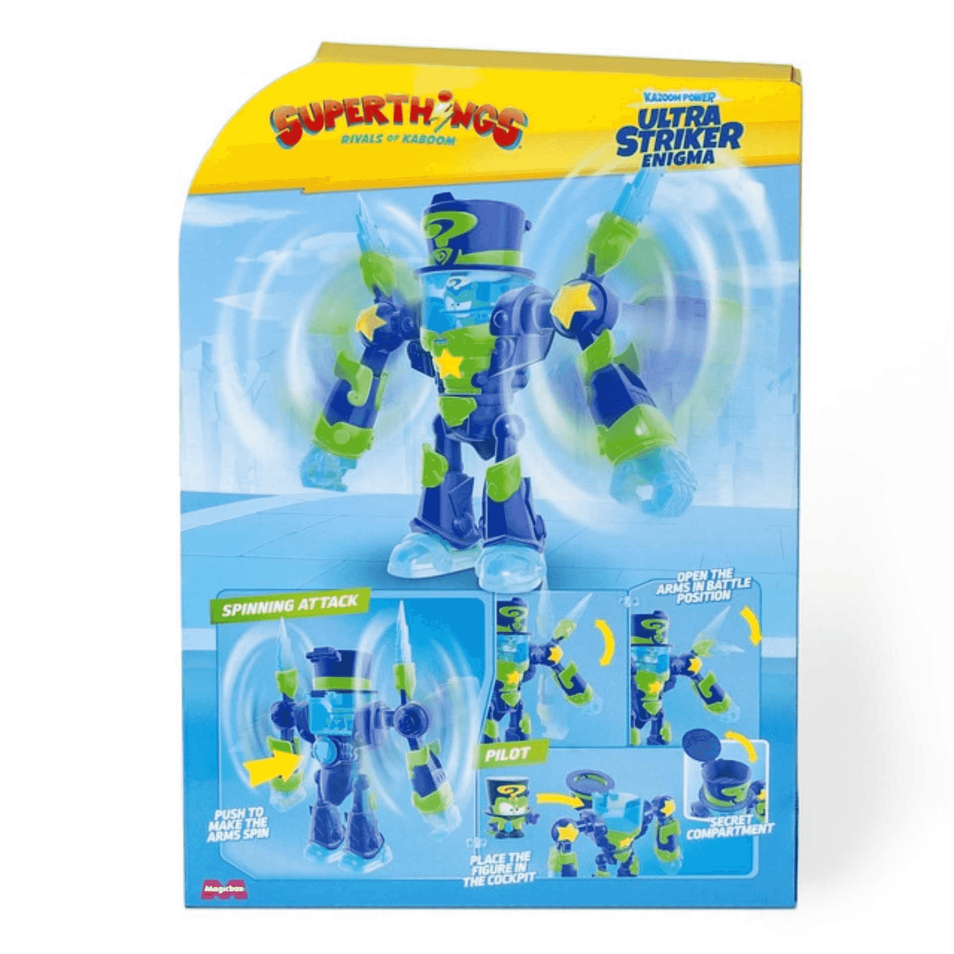 El Ultra Striker de Enigma ha llegado para cambiar el rumbo de la batalla en SuperThings Kazoom Power Mission. Este increíble robot articulado está equipado con un ataque giratorio y una cabina especial para que Enigma pueda pilotarlo y enfrentarse a los villanos de Kaboom City.
