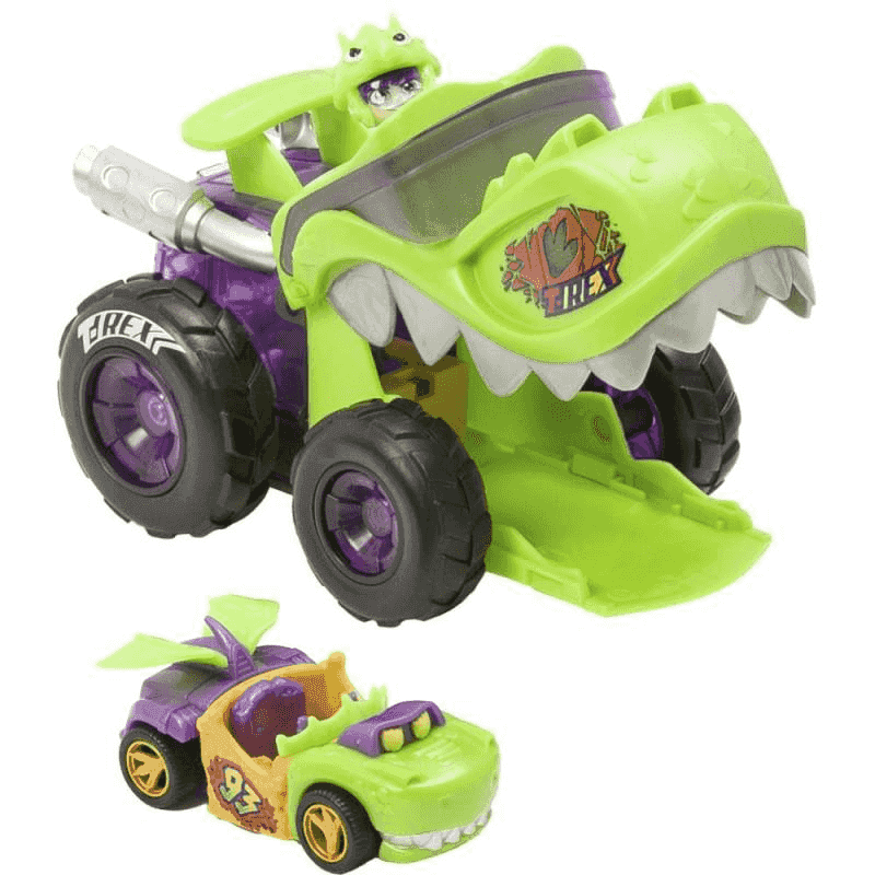 El T-Racers Mega Wheels T-Rex es un coche de carreras imponente, con diseño de dinosaurio y ruedas gigantes listas para cualquier desafío. Incluye una figura exclusiva de piloto y partes intercambiables para personalizar y mezclar con otros vehículos Mega Wheels.