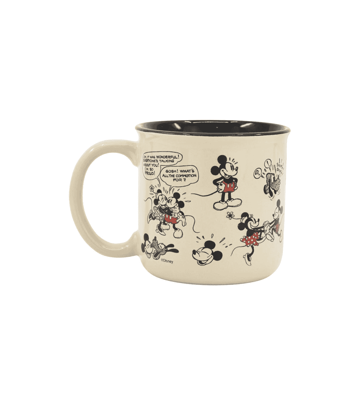 Elaborada en cerámica de calidad, su diseño de inspiración clásica presenta un dibujo sutil del icónico Mickey Mouse con un toque vintage, ideal para quienes aman lo atemporal. Su capacidad de 400 ml permite disfrutar de tus bebidas favoritas —ya sea café, chocolate caliente o té— sin preocuparte por recargas inmediatas.