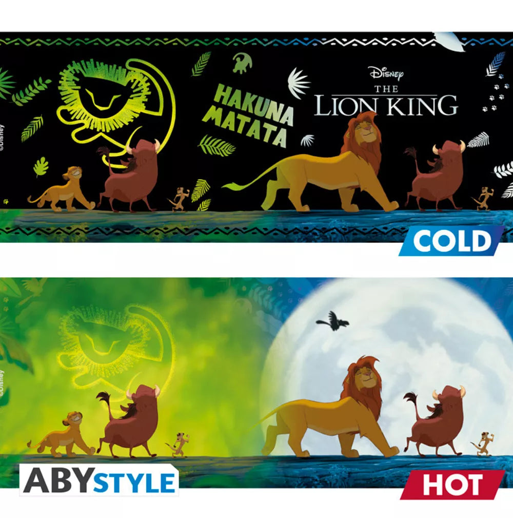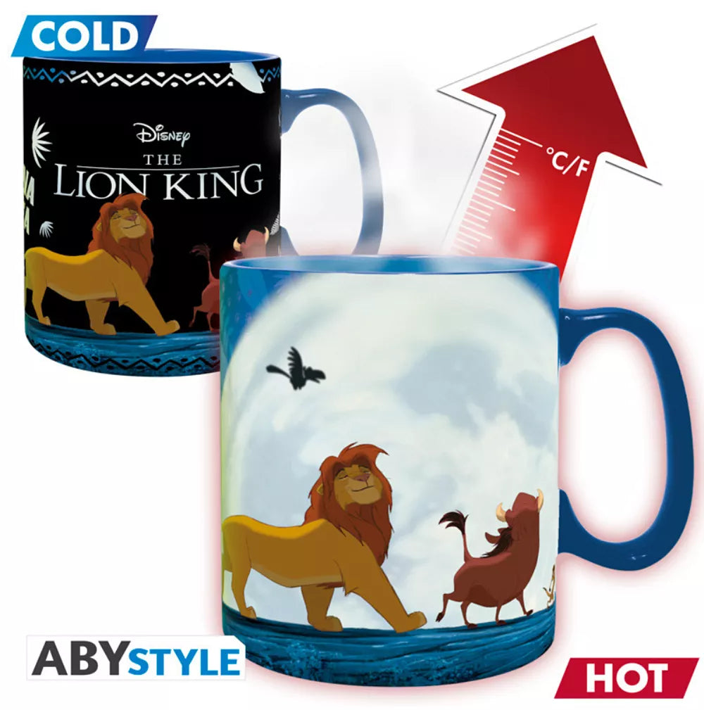 La taza termorreactiva de El Rey León de Disney te invita a empezar el día sin preocupaciones. Al verter tu bebida caliente, aparecen Simba, Timón y Pumba caminando juntos, mostrando cómo Simba crece acompañado de sus amigos.