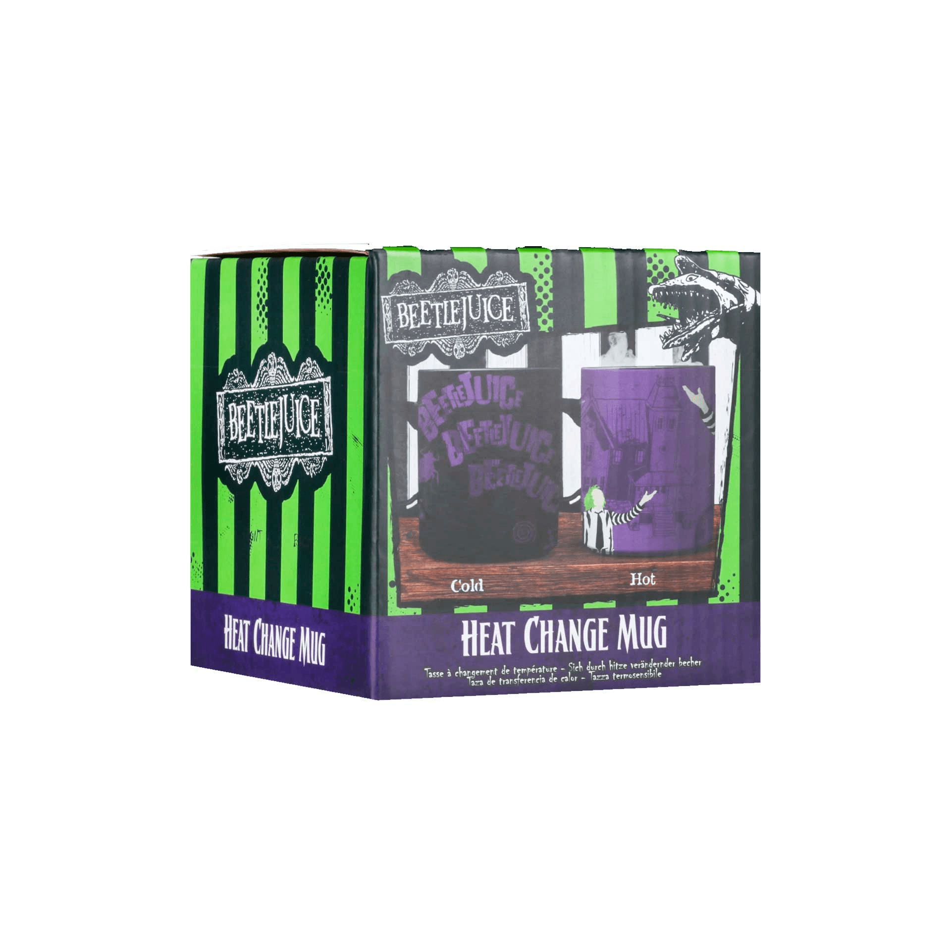 El diseño de cerámica de esta taza de 300 ml presenta el título de la película ´Beetlejuice´ repetido tres veces. Pero lo más emocionante es su capacidad termocromática: al añadir una bebida caliente, el diseño se transforma mágicamente, revelando la icónica casa de Maitland y Beetlejuice con sus rayas blancas y negras reconocibles al instante.