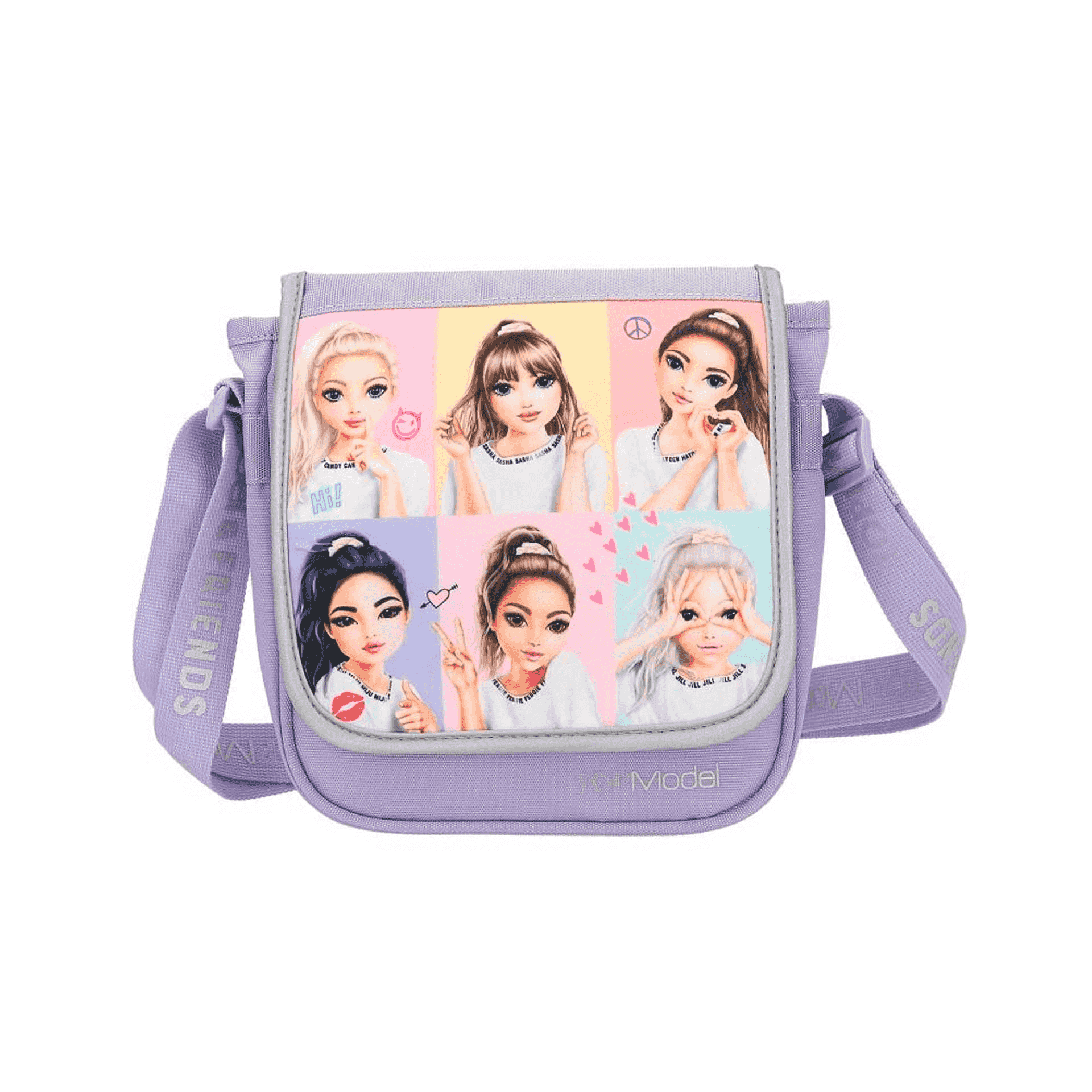 Descubre la elegancia y el estilo con la bandolera pequeña Snap Shots de TOPModel, diseñada para los amantes de la moda y el color. Esta bandolera presenta fotos vibrantes de las supermodelos de TOPModel en la cara delantera, con un fondo de tono lila alegre que complementa su diseño visualmente atractivo.