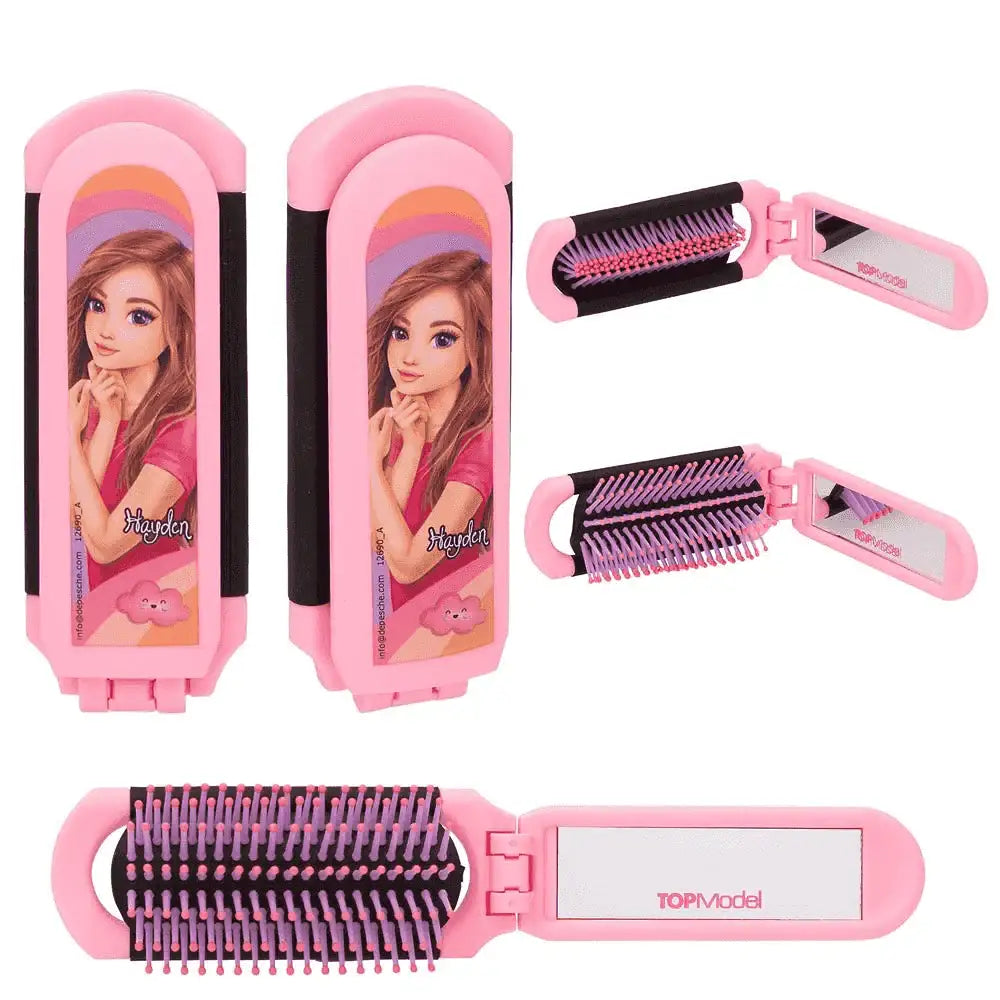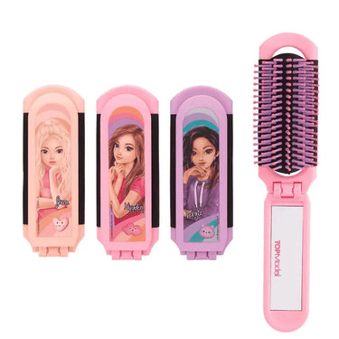 Descripción del producto: Los cepillos alargados plegables de TOPModel tienen mucho estilo y son muy prácticos. Plegados caben en cualquier bolso, llevan un espejo interior y, por supuesto, están adornados con imágenes de modelos muy guapas. En tres colores: rosal, lila y albaricoque.