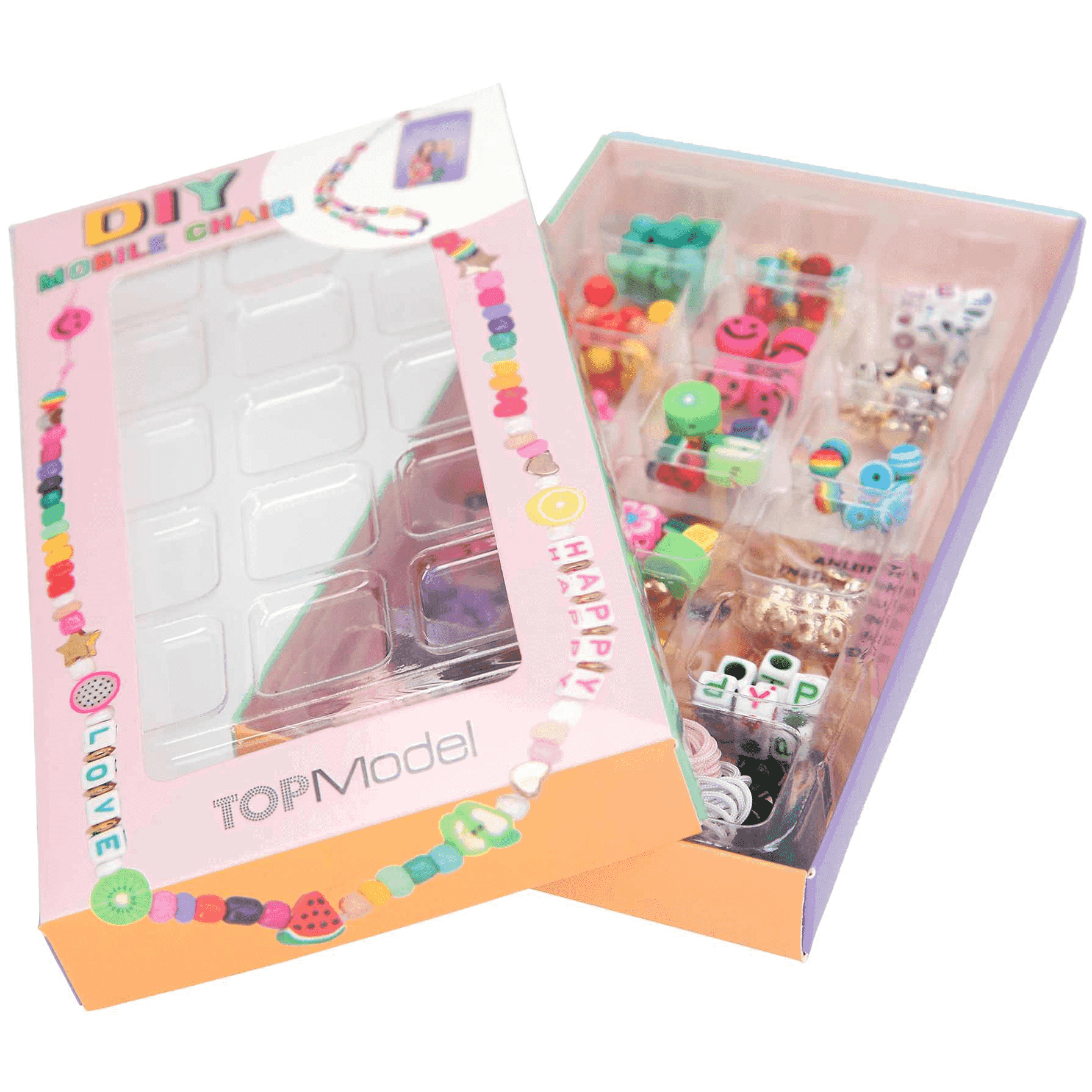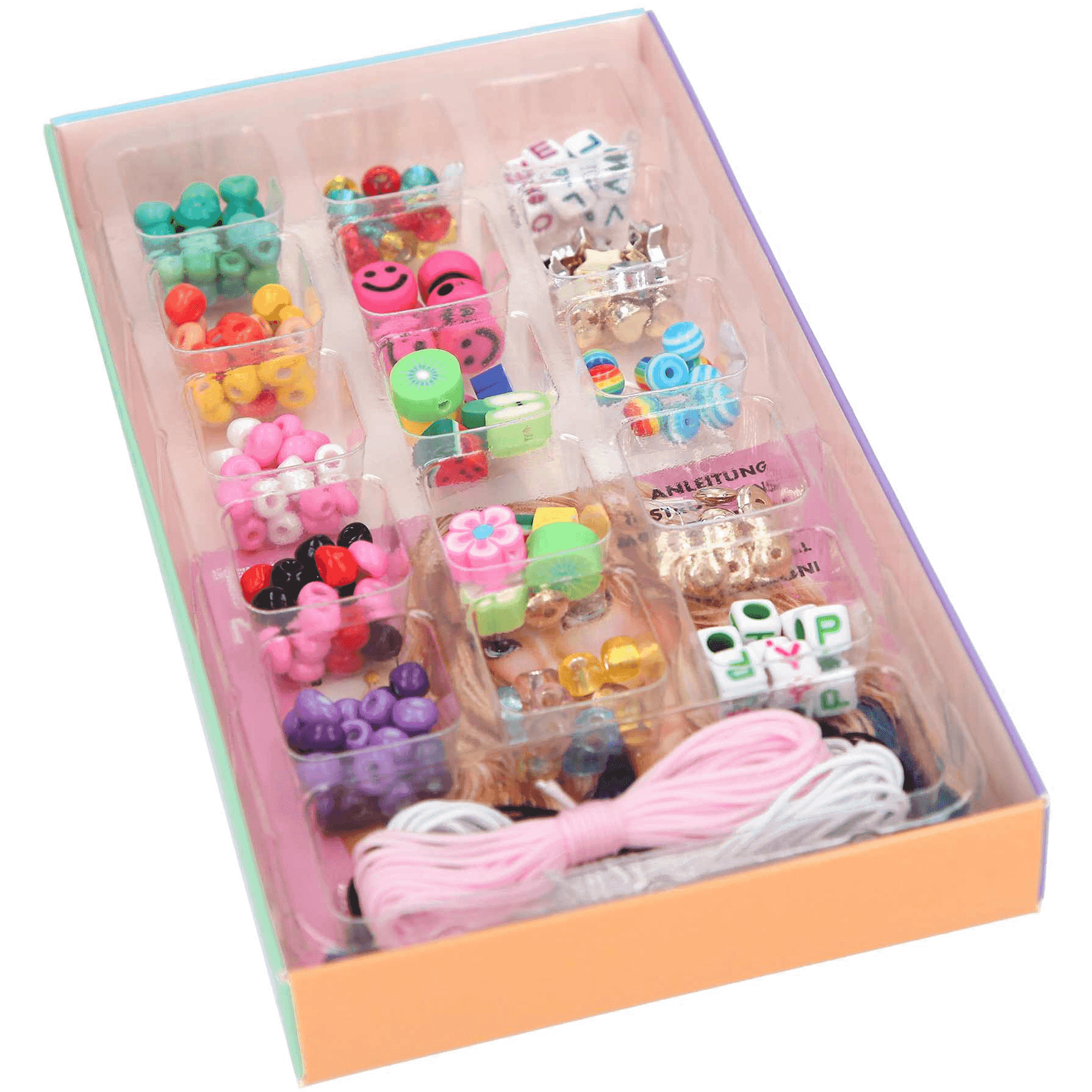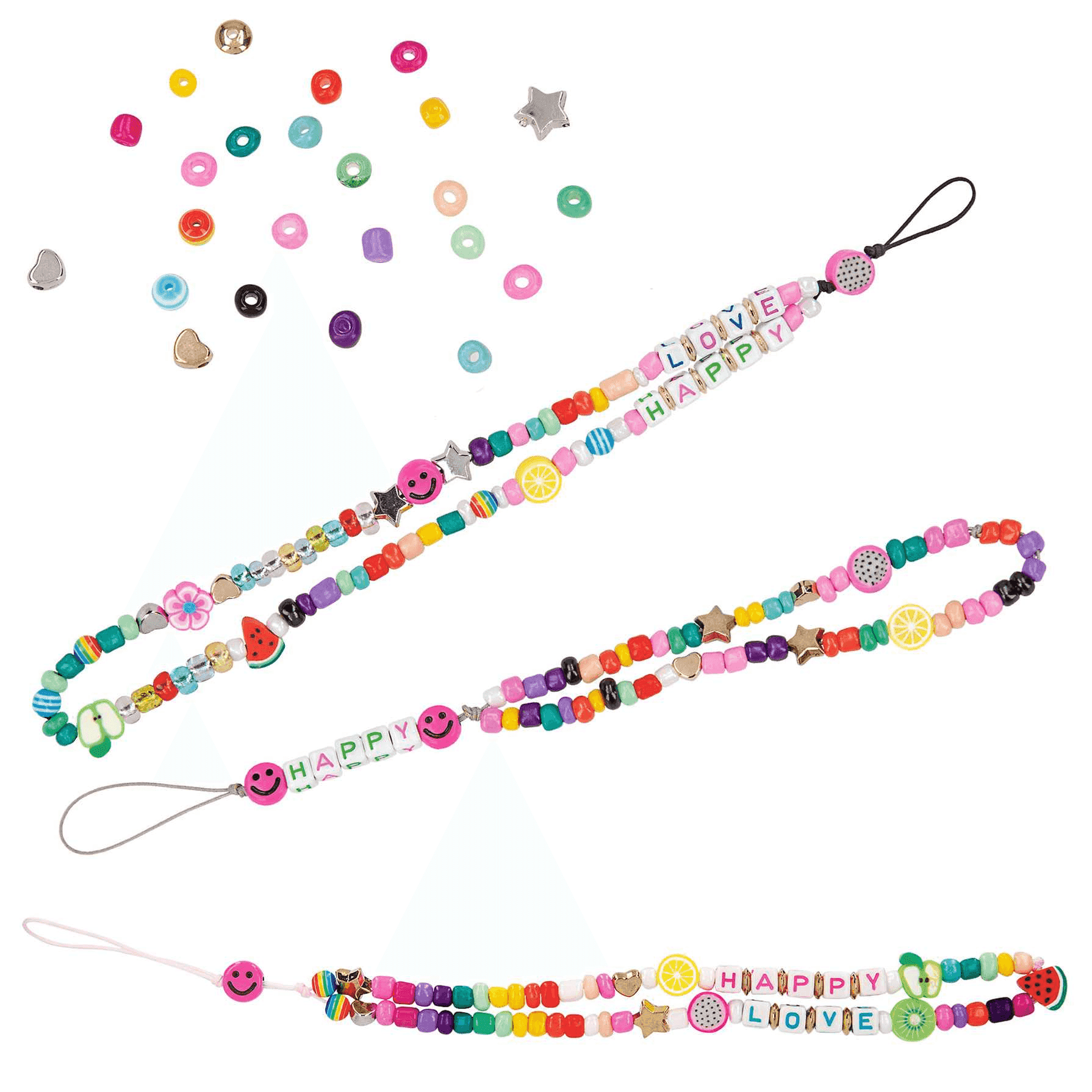 El set incluye 3 cintas de 2 m cada una, 225 cuentas de modelos diferentes, letras e instrucciones.