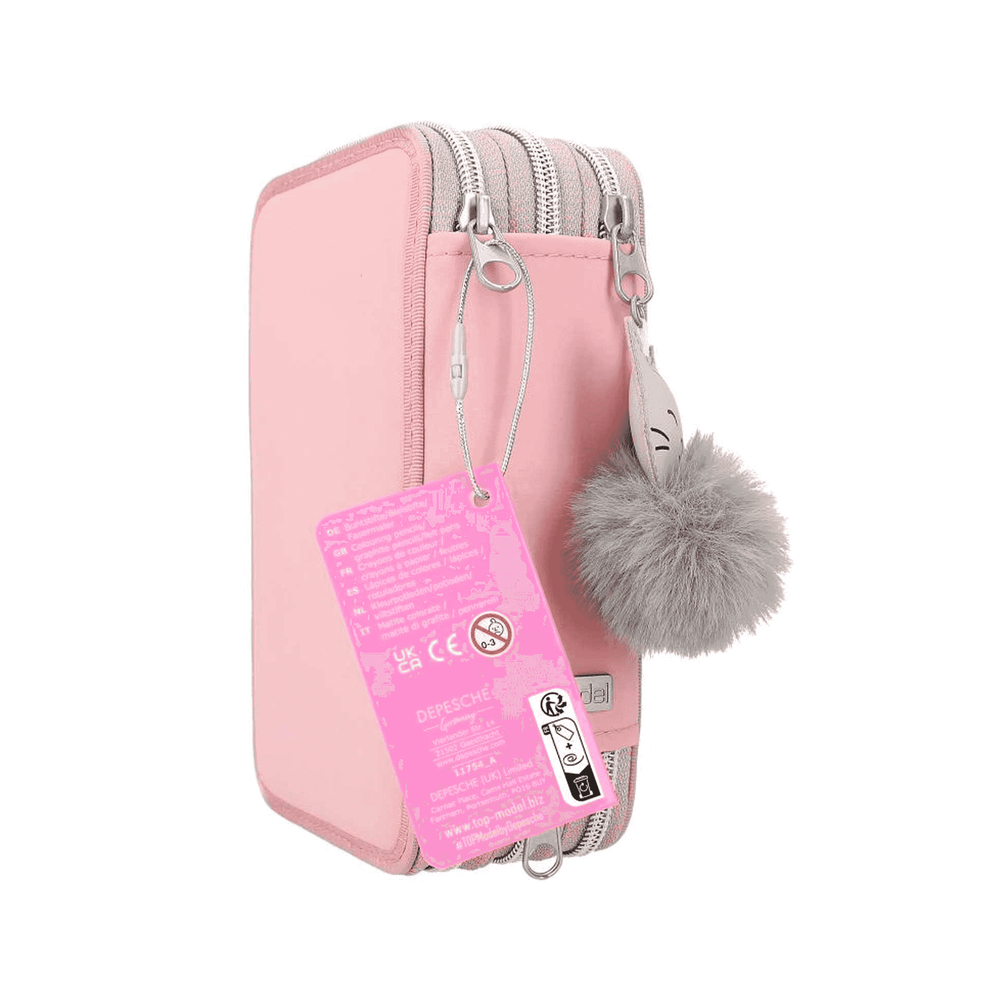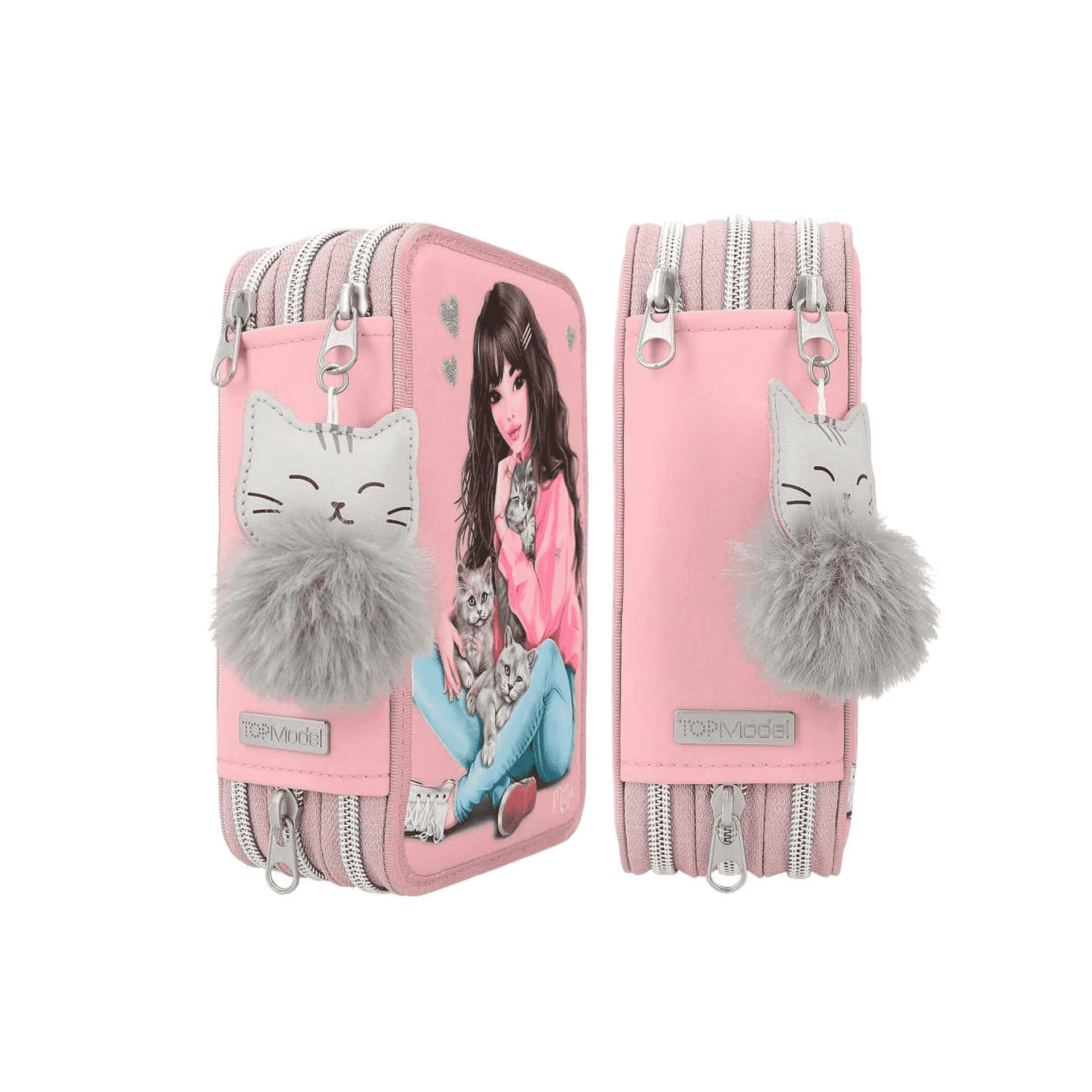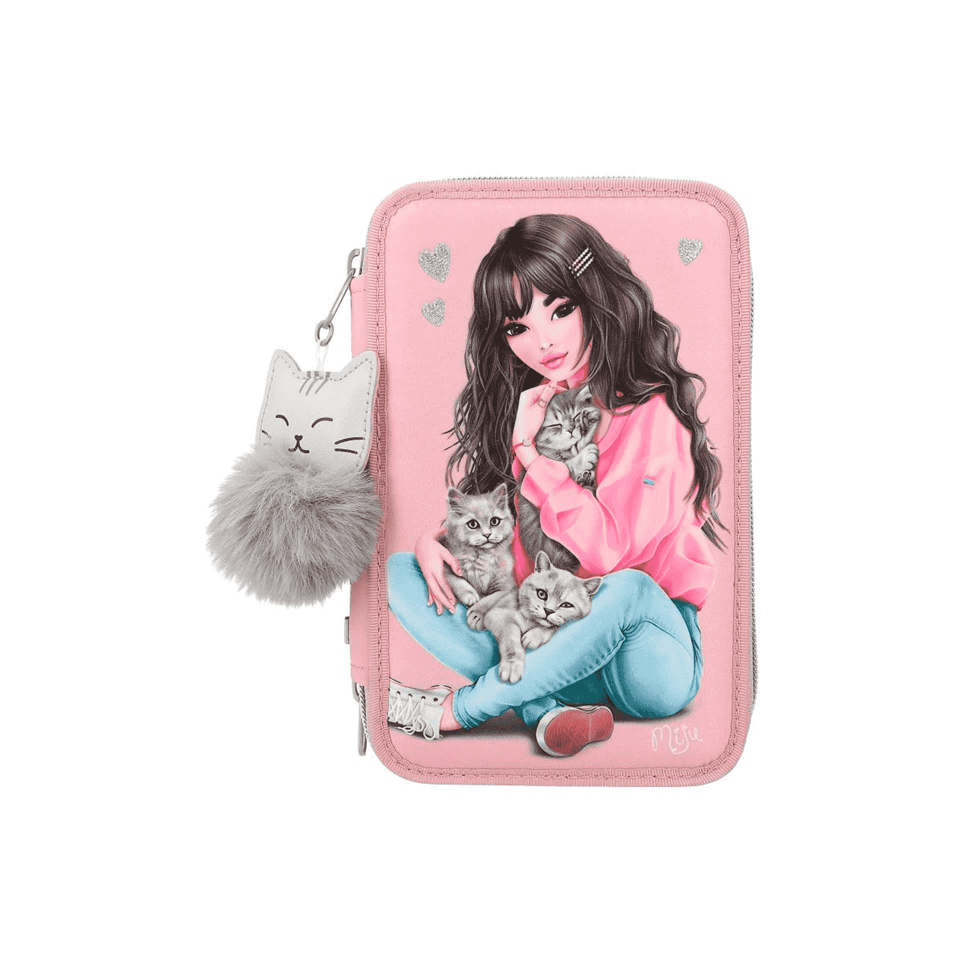 ¡Miau, guau! Este estuche color rosa empolvado de TOPModel lleva como motivo principal de la cara delantera modelos con gatitos monísimos y corazones plateados bordados. Además, incluye un extra ideal: un gatito de peluche colgando de la cremallera. Los tres compartimentos separados están completamente llenos con: 18 lápices de colores, 18 rotuladores, 2 lápices, goma de borrar, sacapuntas, regla, tijeras y pegamento en barra.