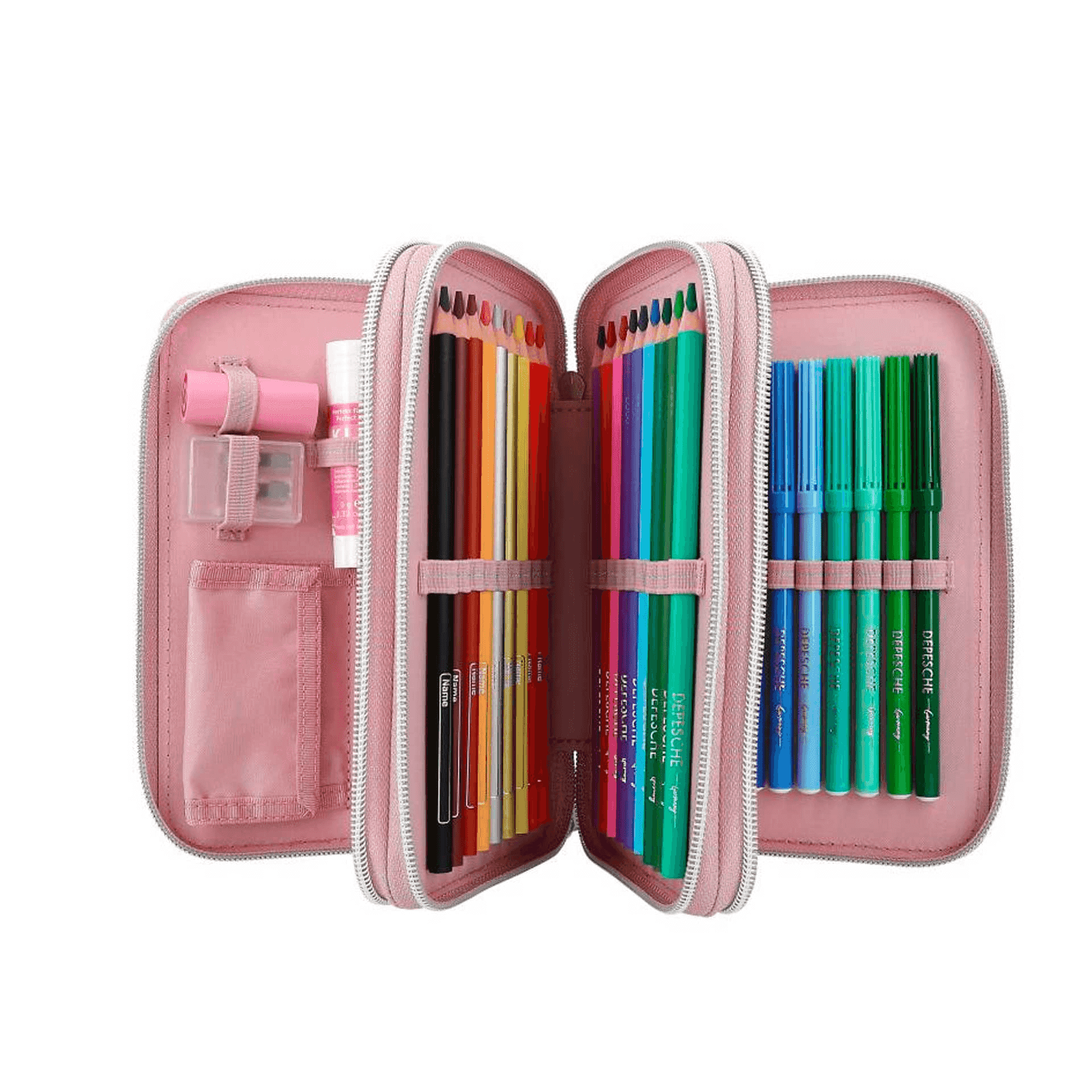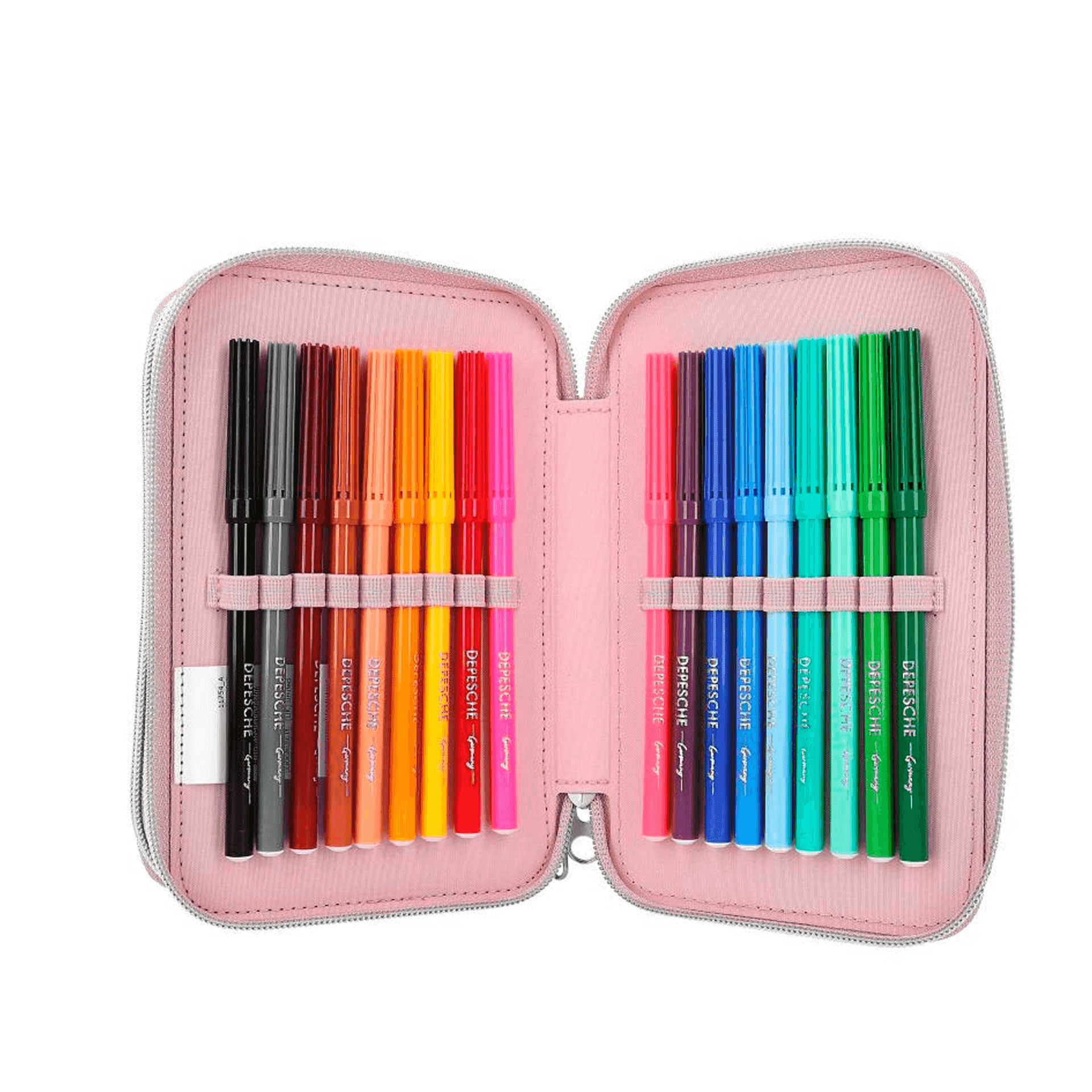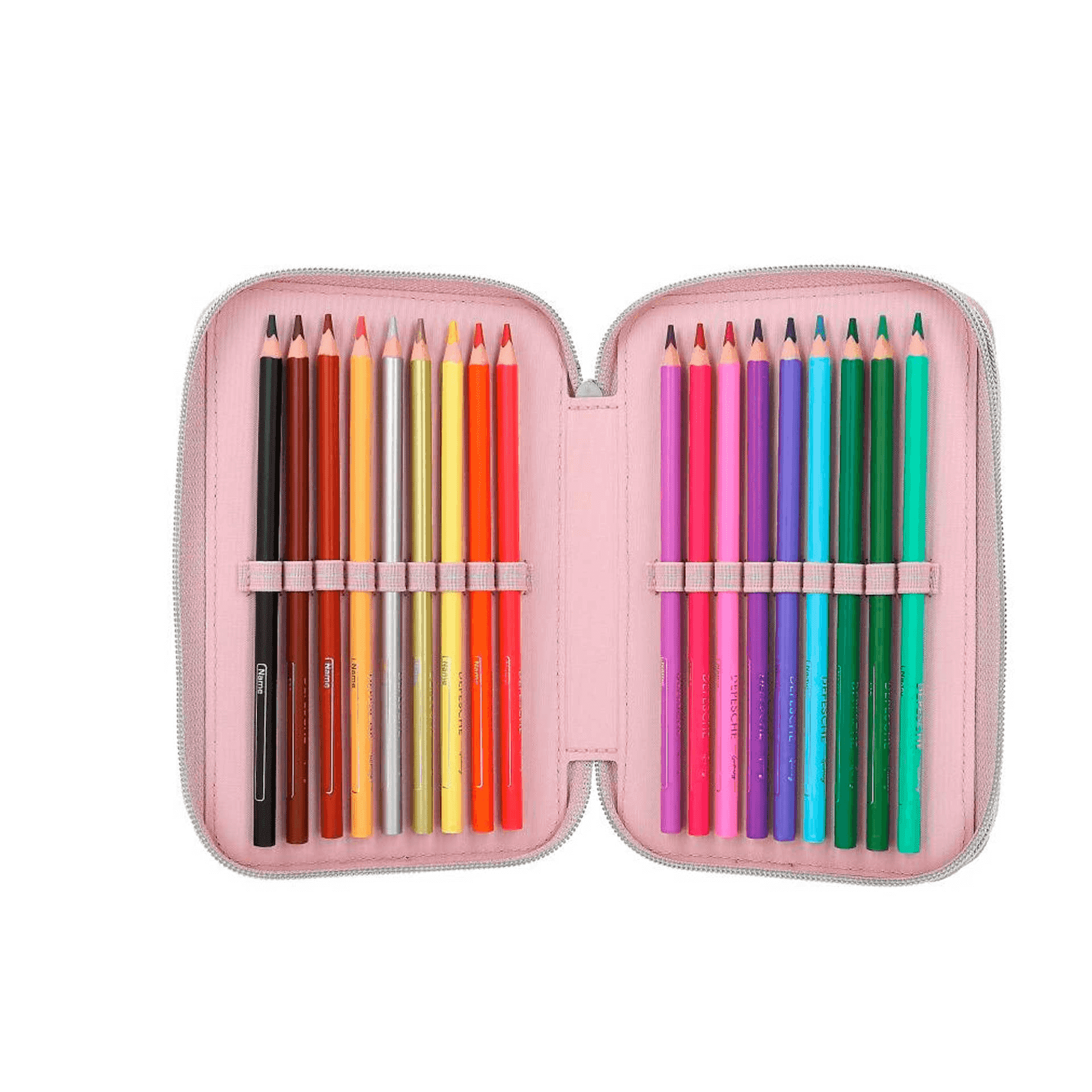 - Equipado Completamente: Tres compartimentos separados llenos con 18 lápices de colores, 18 rotuladores, 2 lápices, goma de borrar, sacapuntas, regla, tijeras y pegamento en barra.