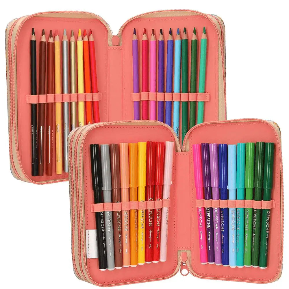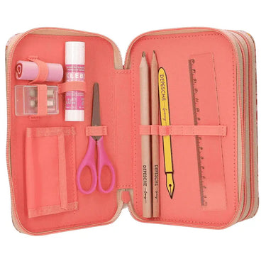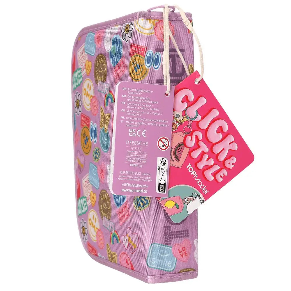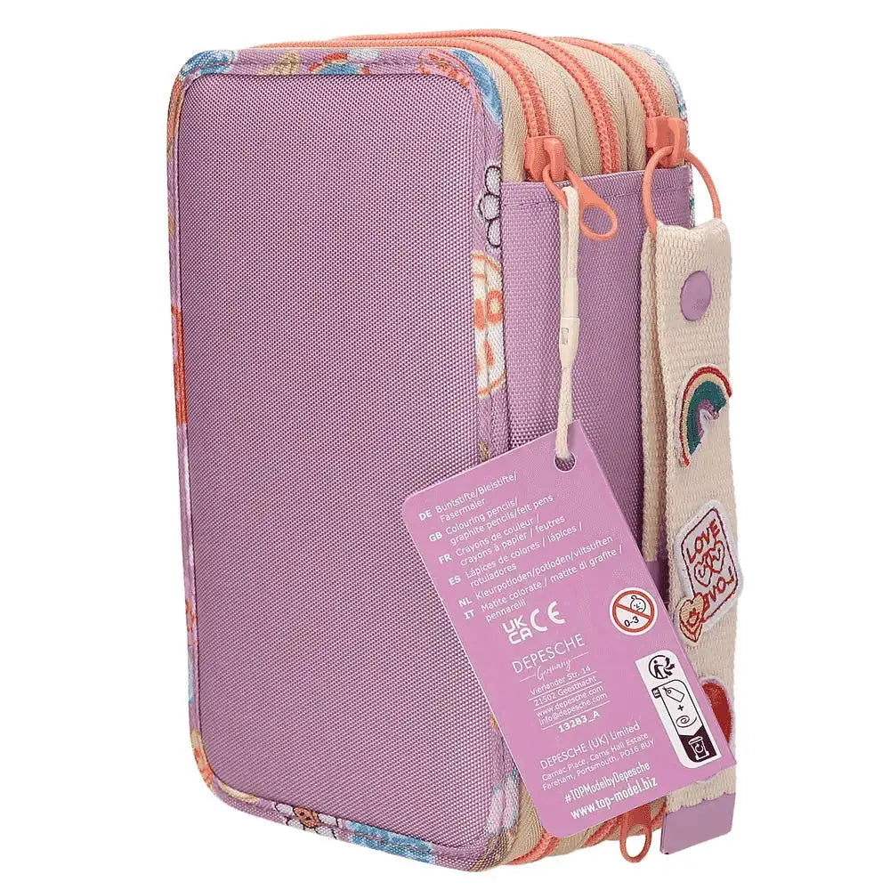 Descripción del producto: Este estuche lila lleva una modelo a gran tamaño en la cara principal. Un detalle que destaca son los bordes cosidos con estampado colorido tipo batch. Los tres compartimentos separados vienen completamente llenos con 18 lápices de colores, 18 rotuladores, 2 lápices, sacapuntas, goma de borrar, regla, tijeras e incluso va provisto de un bolsillito interior con cierre de velcro. Material principal: poliéster 100 por 100.
