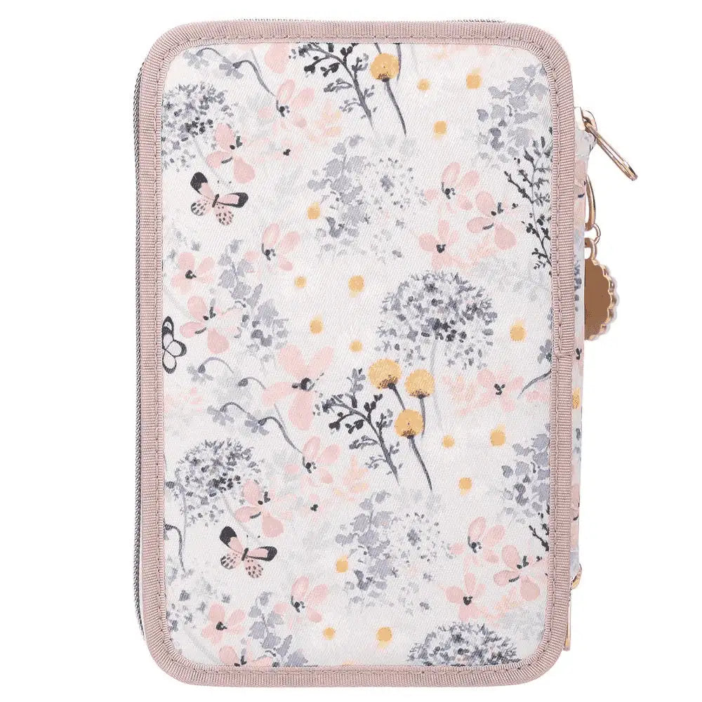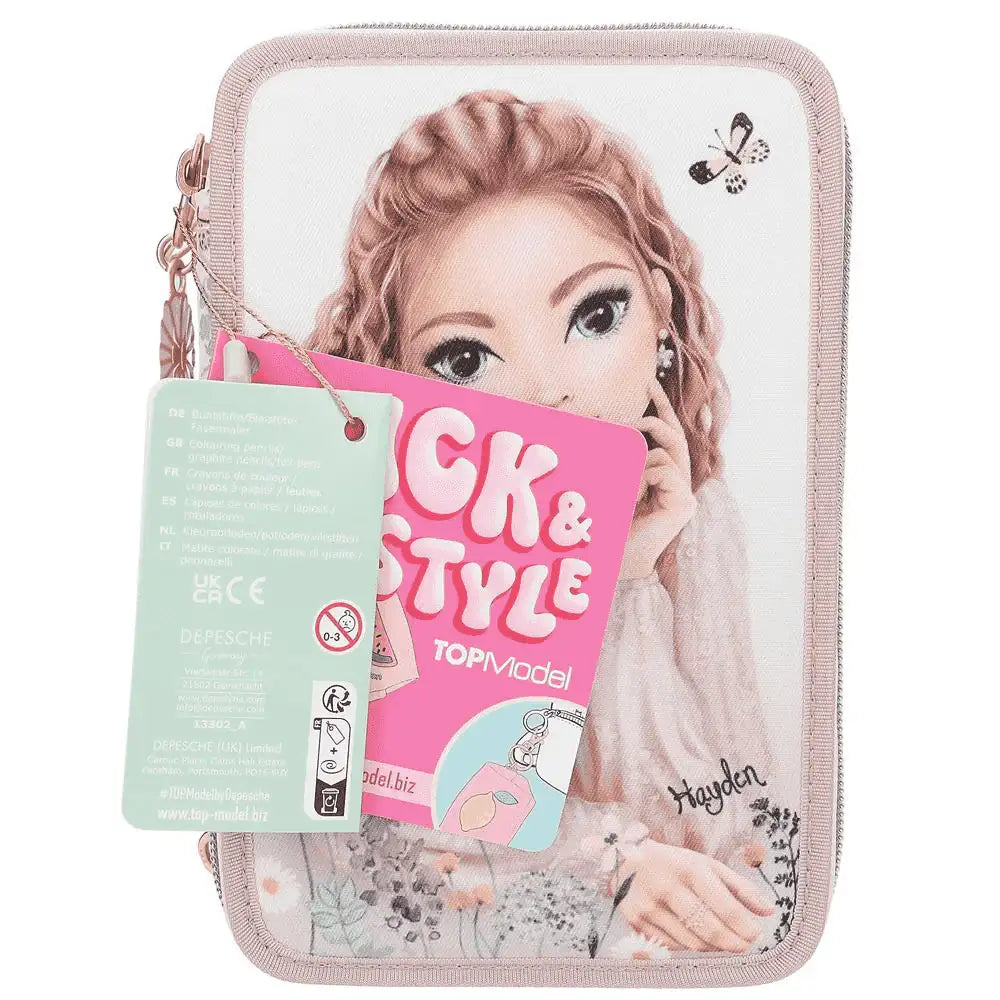 Descripción del producto: ¡Fantásticamente floral! El estuche de 3 pisos de TOPModel lleva un romántico motivo de una modelo rodeada de delicadas flores y mariposas. Plus monísimo: el colgante de flor en la cremallera. Los tres compartimentos separados vienen completamente llenos con 18 lápices de colores, 18 rotuladores, 2 lápices, sacapuntas, goma de borrar, regla, tijeras y pegamento en barra; el estuche incluso va provisto de un bolsillito interior con cierre de velcro. Material: poliéster 100 por 100.