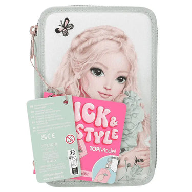 Descripción del producto: La cara delantera de este estuche de 3 pisos color verde salvia de TOPModel está adornada con un romántico motivo de una modelo rodeada de delicadas flores y mariposas, algunas de ellas bordadas. Los tres compartimentos separados vienen completamente llenos con 18 lápices de colores, 18 rotuladores, 2 lápices, sacapuntas, goma de borrar, regla, tijeras y pegamento en barra; el estuche incluso va provisto de un bolsillito interior con cierre de velcro. Material: poliéster 100 por 100.