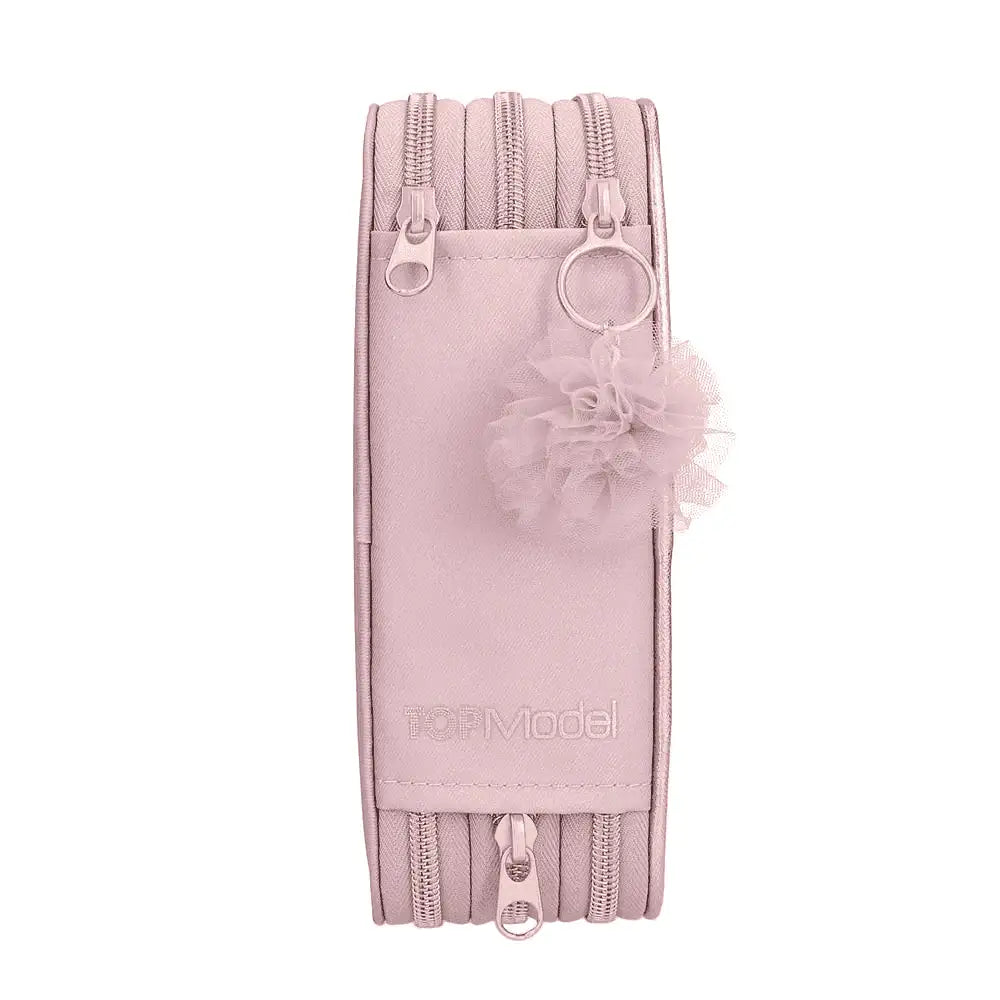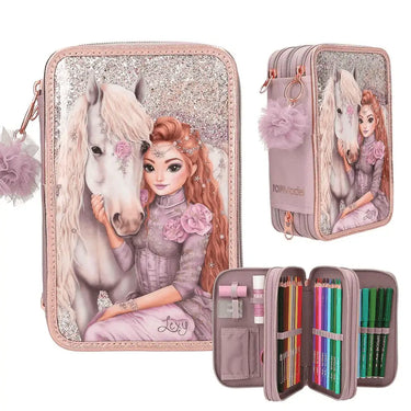 Descripción del producto: Viva Violet: El estuche de TOPModel color lila apagado lleva en la cara delantera una modelo sentada junto a un majestuoso caballo sobre fondo de purpurina. Destaca un orignal colgante de tul con forma de flor en el tirador de la cremallera. Los tres compartimentos separados se venden completamente llenos con 18 lápices de colores, 18 rotuladores, 2 lápices, sacapuntas, goma de borrar, regla, tijeras y pegamento en barra. En el interior del estuche encontramos también de un bolsillo con cierre de velcro. Material: PES 100 por 100; cara delantera de PVC.