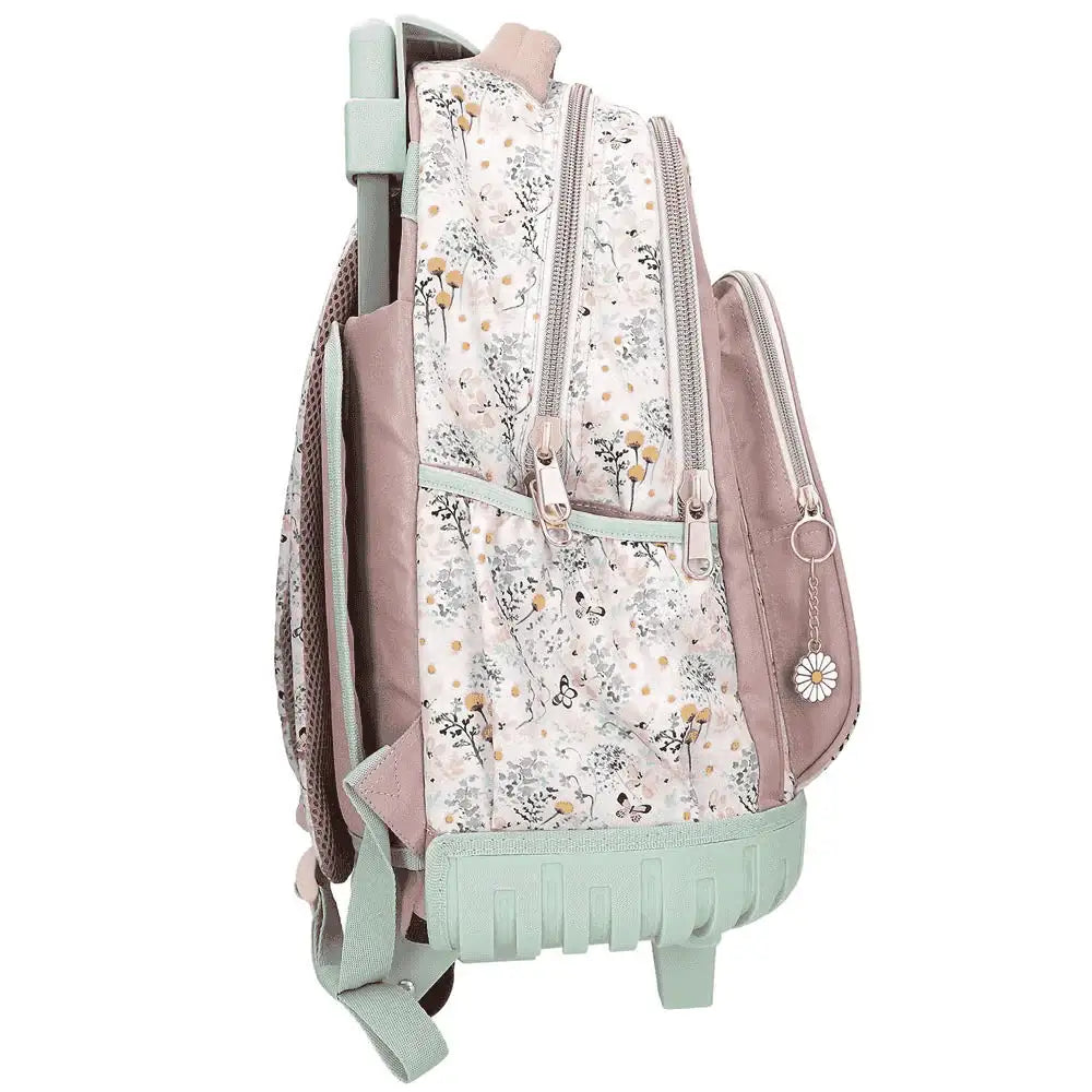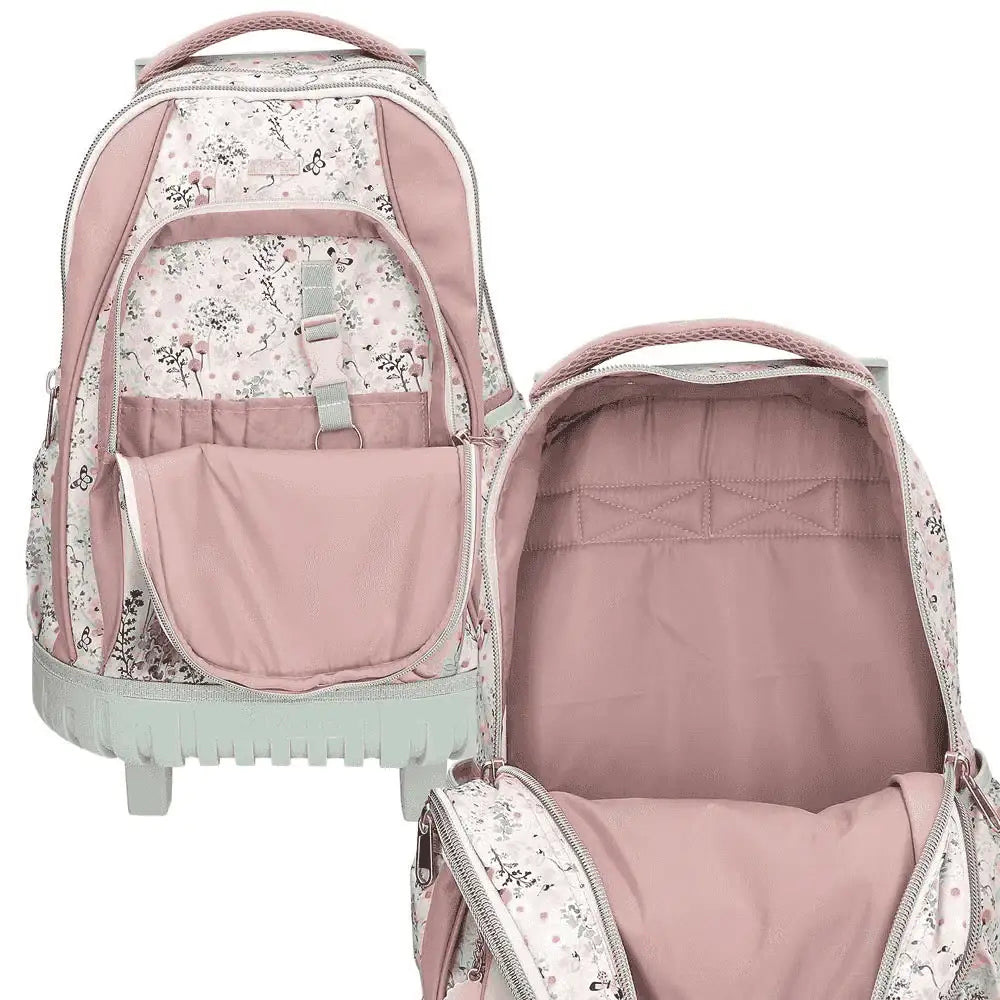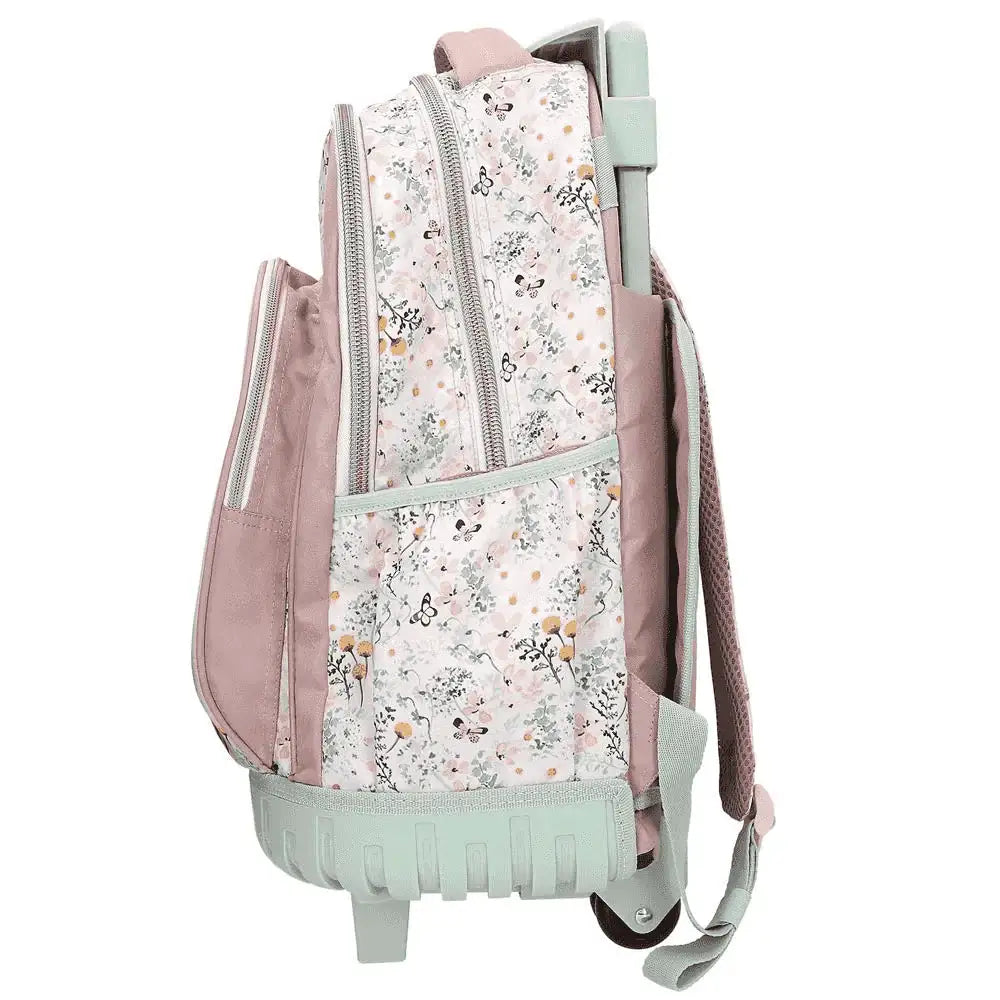 Descripción del producto: La cara delantera de esta mochila escolar de TOPModel con trolley incorporado está decorada con un motivo romántico de una modelo rodeada de delicadas flores y mariposas, que también adorlos tirantes y los laterales. En suaves tonos rosa y verde salvia. Extra monísimo: el colgante de flor en la cremallera. El tirador telescópico del trolley tiene una extension máxima de 86 cm aprox. y las ruedas son de marcha muy suave. Si se lleva la mochila colgada existe la posibilidad de cubrir las ruedas con un guardabarros retráctil para evitar que se ensucie la ropa. Los tres compartimentos y los bolsillos laterales ofrecen mucho espacio para material escolar y fiambrera (volumen: 28 l). Dimensiones: 34x24x50 cm. Peso: 2 kg aprox. Material: PES 100 por 100.
