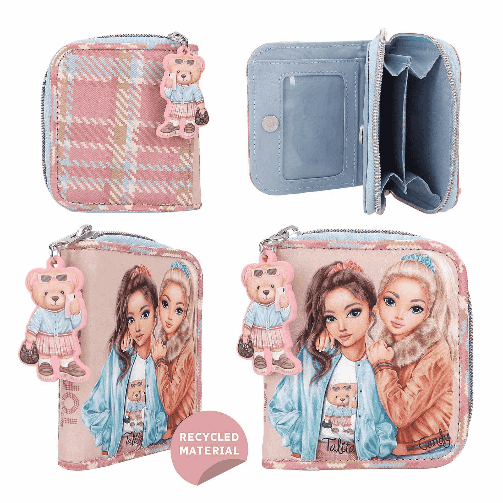 ¡Bienvenida al team Teddy! La cartera de TOPModel lleva estampadas dos modelos muy cool en la solapa color beige. Los detalles a cuadros que adornan los bordes y el monísimo colgante de osito hacen que esta cartera destaque y llame la atención. El interior es azul claro y está provisto de varios tarjeteros, ventana transparente para el nombre, billetera y compartimento para monedas con cremallera. Material: poliéster reciclado 100 por 100 cara delantera. Plus monísimo: el colgante de osito en la cremallera. Material: poliéster reciclado 100 por 100. de instrucciones de uso.