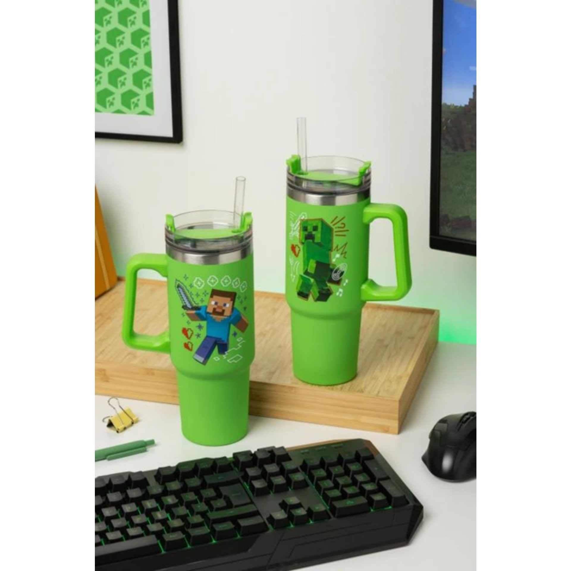 Vaso Térmico Minecraft Verde 900ml con Tapa Multiusos y Pajita