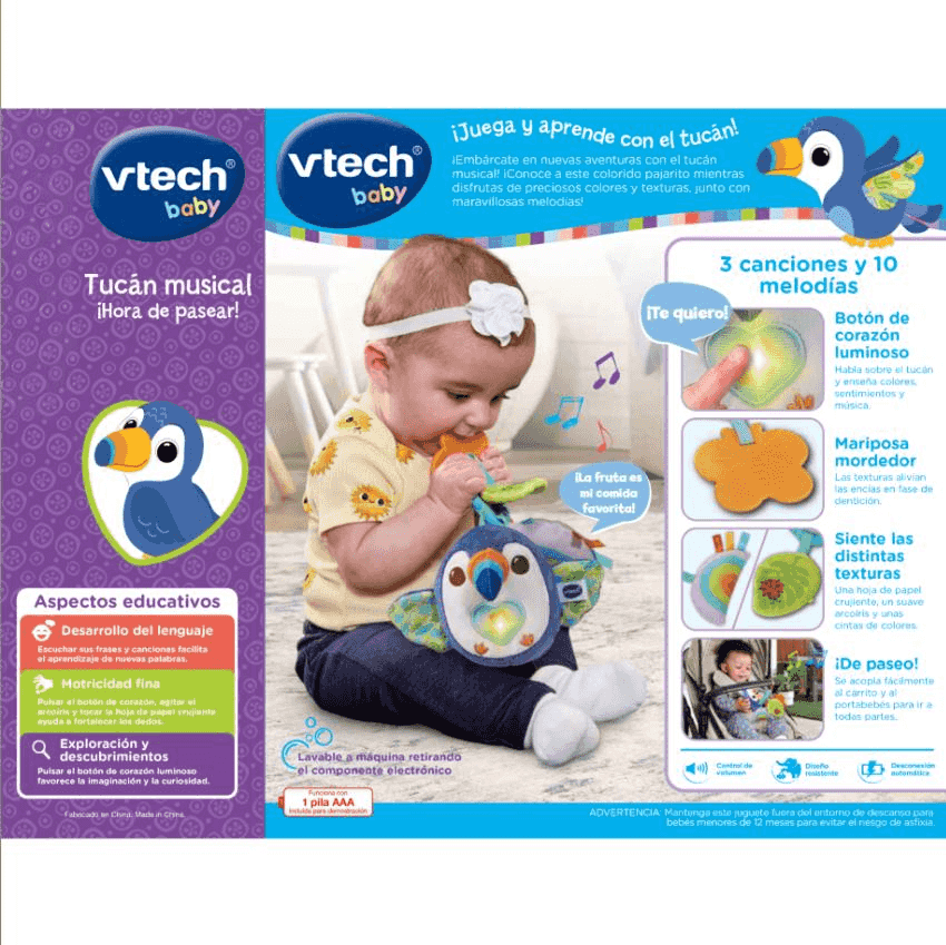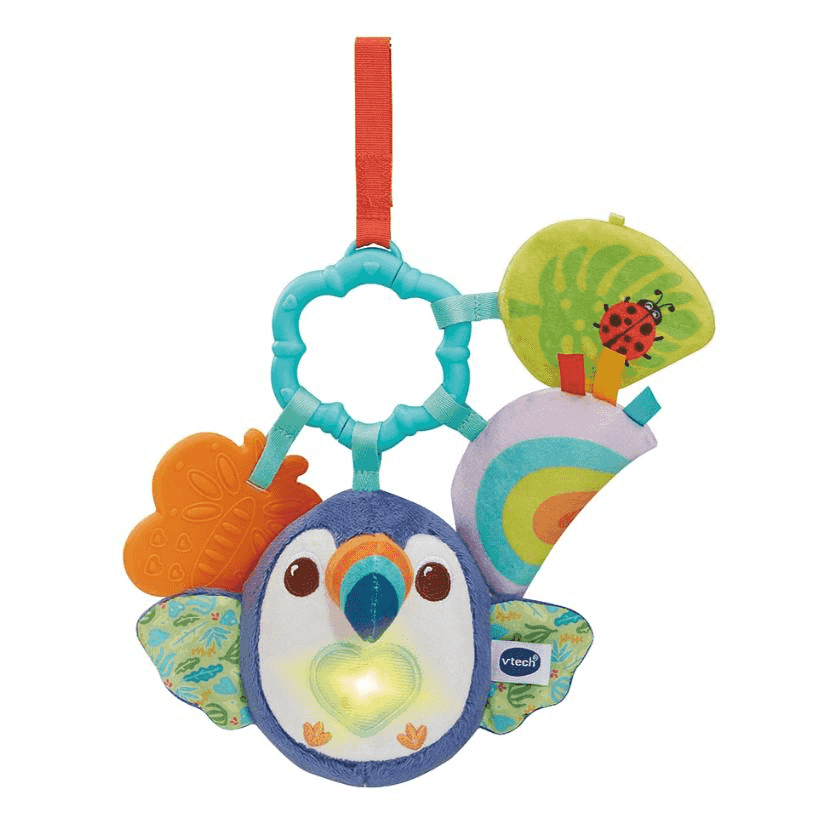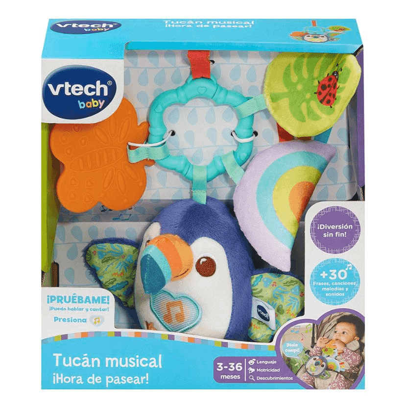 El Tucán Musical ¡Hora de Pasear! de VTech Baby es un juguete sensorial pensado para acompañar al bebé desde los primeros meses durante el paseo en carrito, sillita o portabebés. Su diseño en forma de tucán de suave felpa con colores llamativos y elementos interactivos transforma cada salida en una experiencia divertida y enriquecedora.
