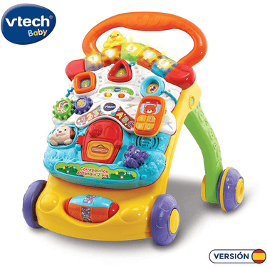 ¡El correpasillos V-Tech en versión mejorada! Fabuloso correpasillos 2 en 1 en color amarillo, naranja y verde, para ayudar al desarrollo del bebé.