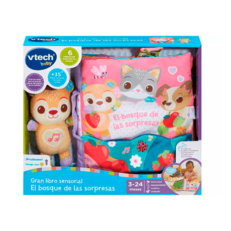 El Gran Libro Sensorial Bosque de las Sorpresas Rosa de VTech es un juguete interactivo pensado para bebés desde los 3 meses. Este libro de tela combina luz, sonido y texturas para ofrecer una experiencia multisensorial que promueve la curiosidad, la exploración y el desarrollo temprano de habilidades psicomotoras y cognitivas.