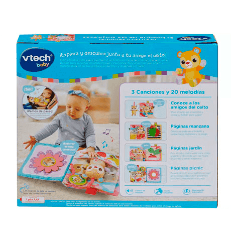 ¿Qué es y qué incluye? Se trata de un libro de tela suave, de tamaño cómodo para manos pequeñas, con páginas que integran texturas variadas, elementos móviles, ilustraciones atractivas y un osito extraíble. Un botón luminoso activa melodías, frases y canciones que acompañan al bebé mientras descubre cada página, añadiendo estímulos auditivos a la experiencia táctil. El osito electrónico se puede retirar para facilitar el lavado de las páginas de tela.