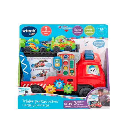 El Trailer Portacoches Carga y Descarga de VTech dentro de la línea Tut Tut Bólidos es un camión interactivo diseñado para niñ@s a partir de los 12 meses que combina juego imaginativo con estimulación sensorial y mecánica divertida. Este tráiler permite transportar hasta cuatro vehículos pequeños mientras ofrece luces, sonidos, frases y múltiples elementos para manipular que fomentan la exploración y el juego creativo.