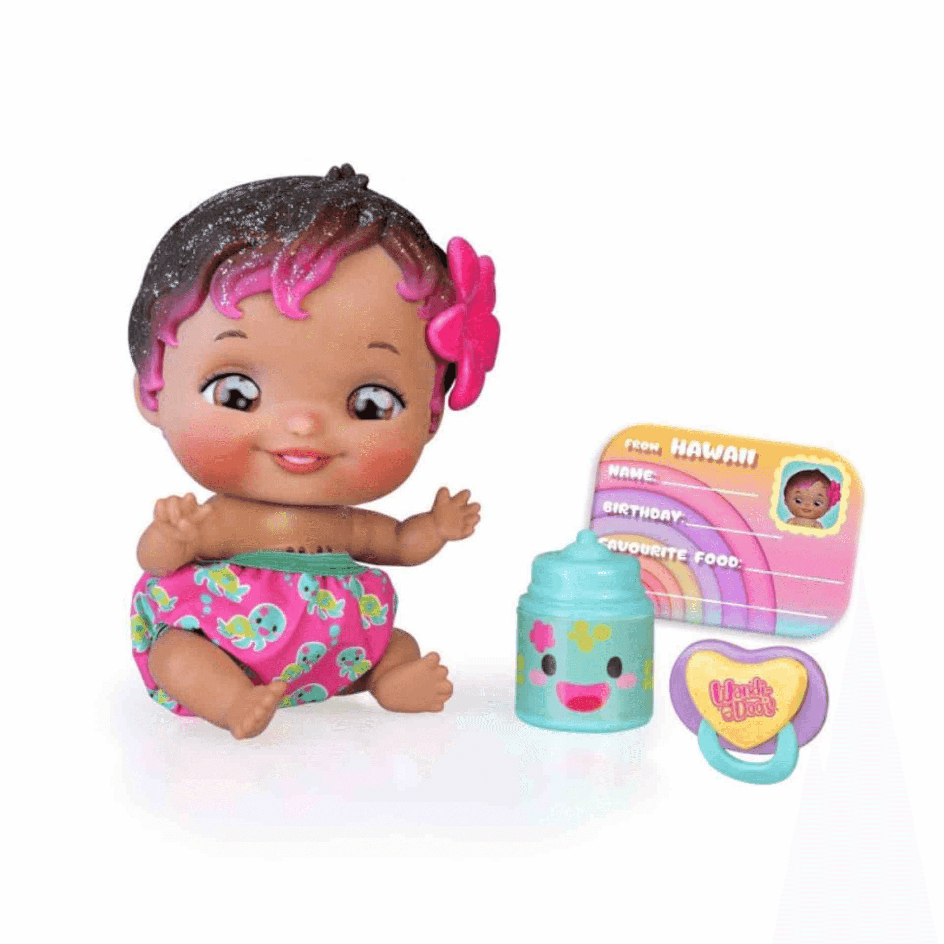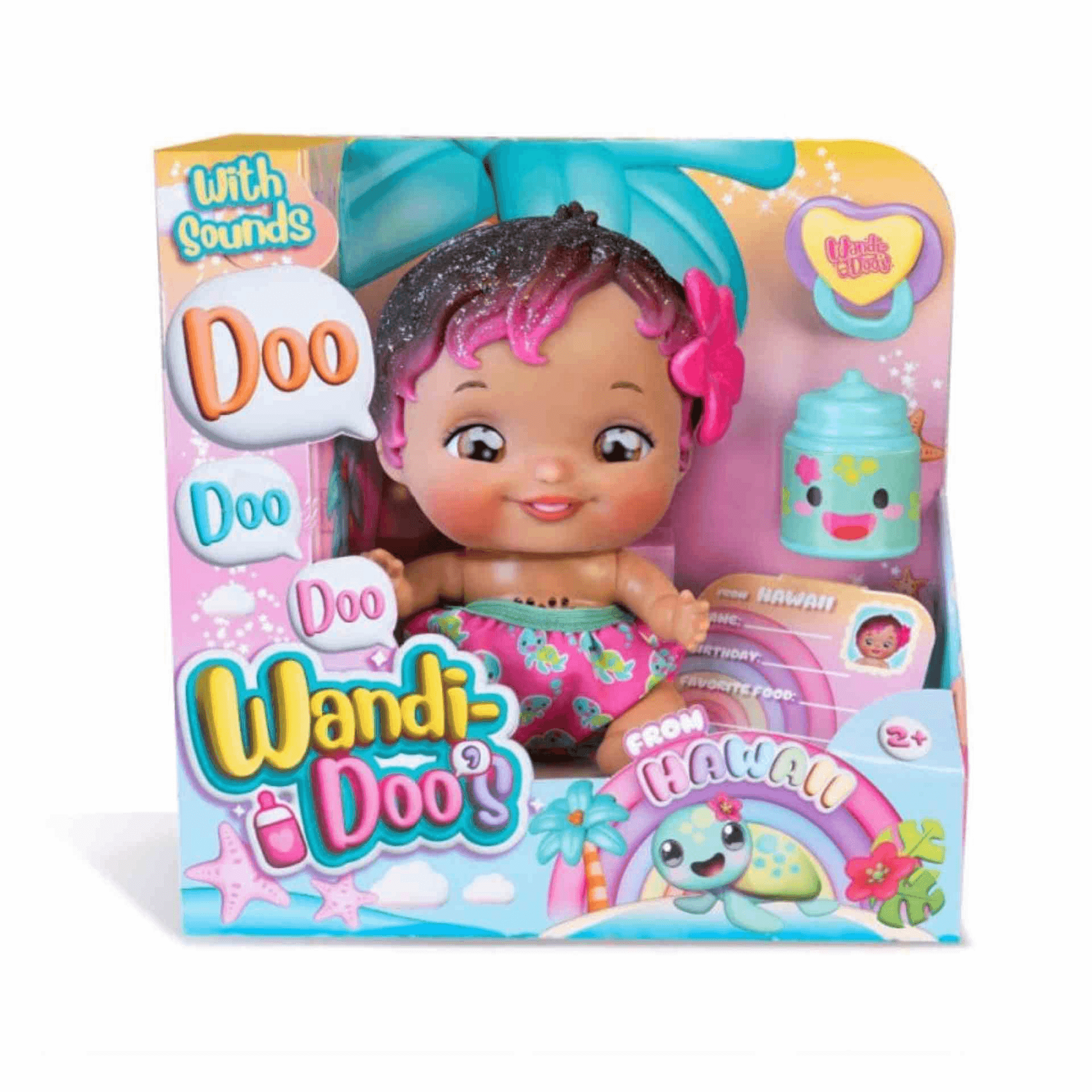 El Wandi-Doo Hawaiian es una adorable bebé que proviene de las islas tropicales. Con detalles únicos como un pañal decorado con tortugas y una flor tropical en el cabello, esta bebé interactiva invita a los niños a cuidarla y mimarla como si fuera un bebé real. Incluye accesorios como biberón y chupete, lo que hace que la experiencia de juego sea completa y divertida.