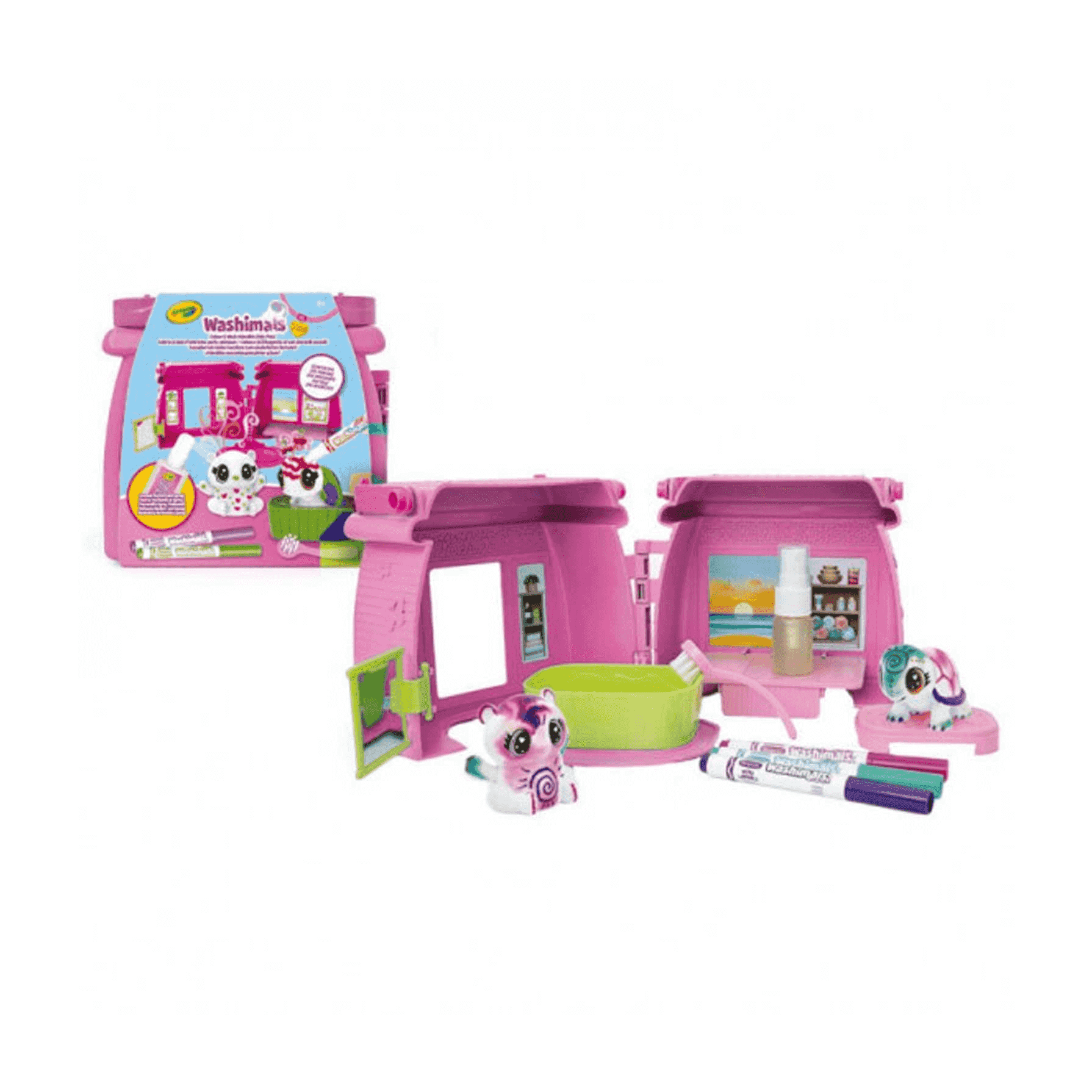 Contenido: 1 maletín con asa, 3 rotuladores lavables olorosos, 2 mascotas lavables, 1 bañera, 1 cepillito y 1 spray perfumado (9ml).