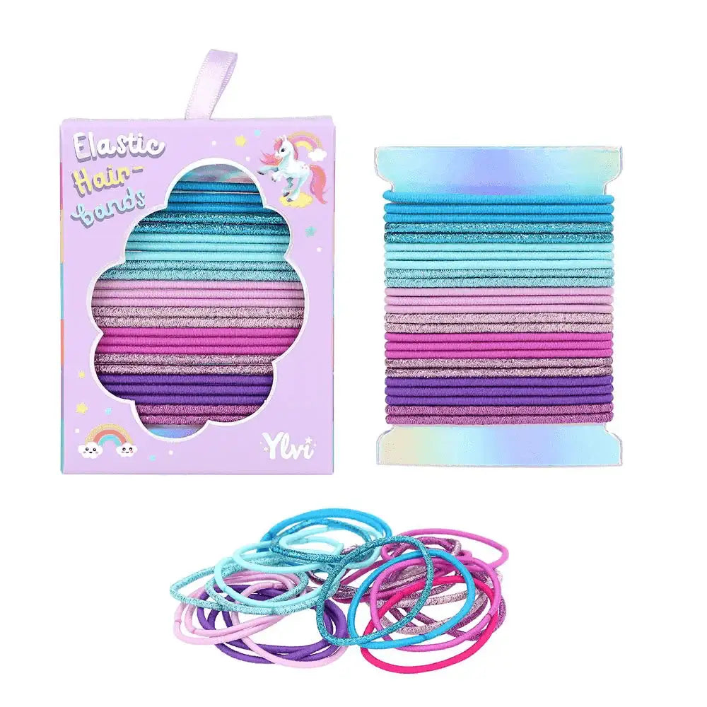 Descripción del producto: ¡Qué cantidad de preciosas gomas para el pelo! 25 gomas para el pelo finas, elásticas y algunas con purpurina. Uno de los sets contiene gomas de colores en distintas gamas de rosa, amarillo, dorado y blanco. El otro set conjunto con diferentes tonos de azul y morado. De Ylvi.